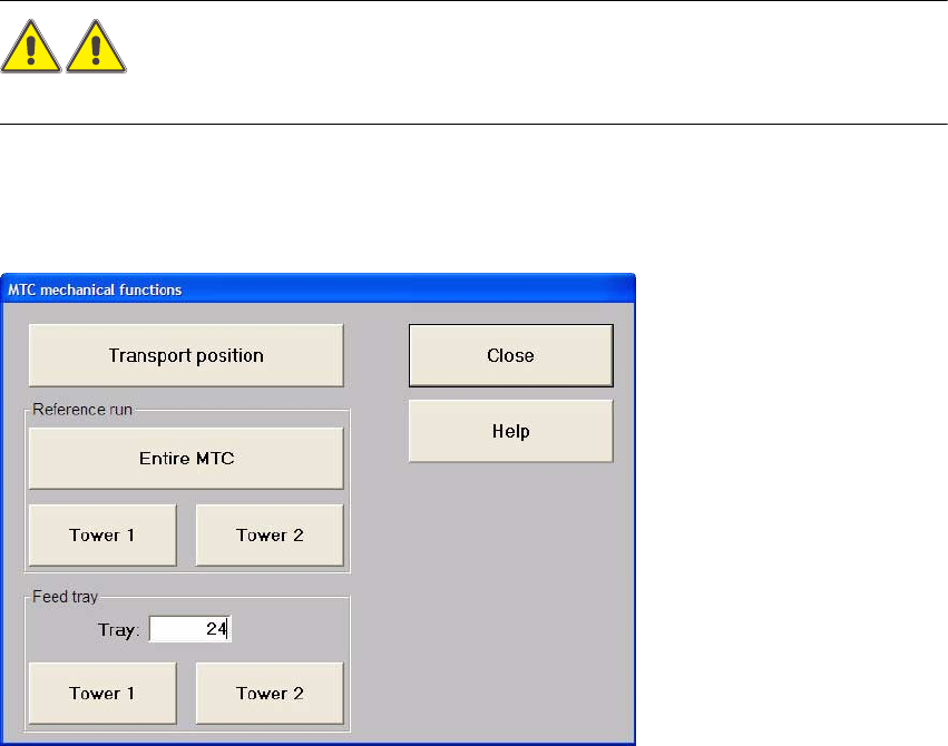 MTC 2 使用 手冊 5 MTC 2 的取置及單 ㆒功能 01/2004 發行 5.3 MTC 2 的單㆒功能 97 5.3.2 " 矩陣式料盤更換器單㆒功能 " 畫面㆗的功能 " 搬運位置 " 按鈕 利用這個功能,MTC 2 可以進入指定的 搬運位置。 註 在執行這個功能時,MTC 2 必須不在補料位置。 " 參考運轉 " 欄: "整 部M T C 2 "…