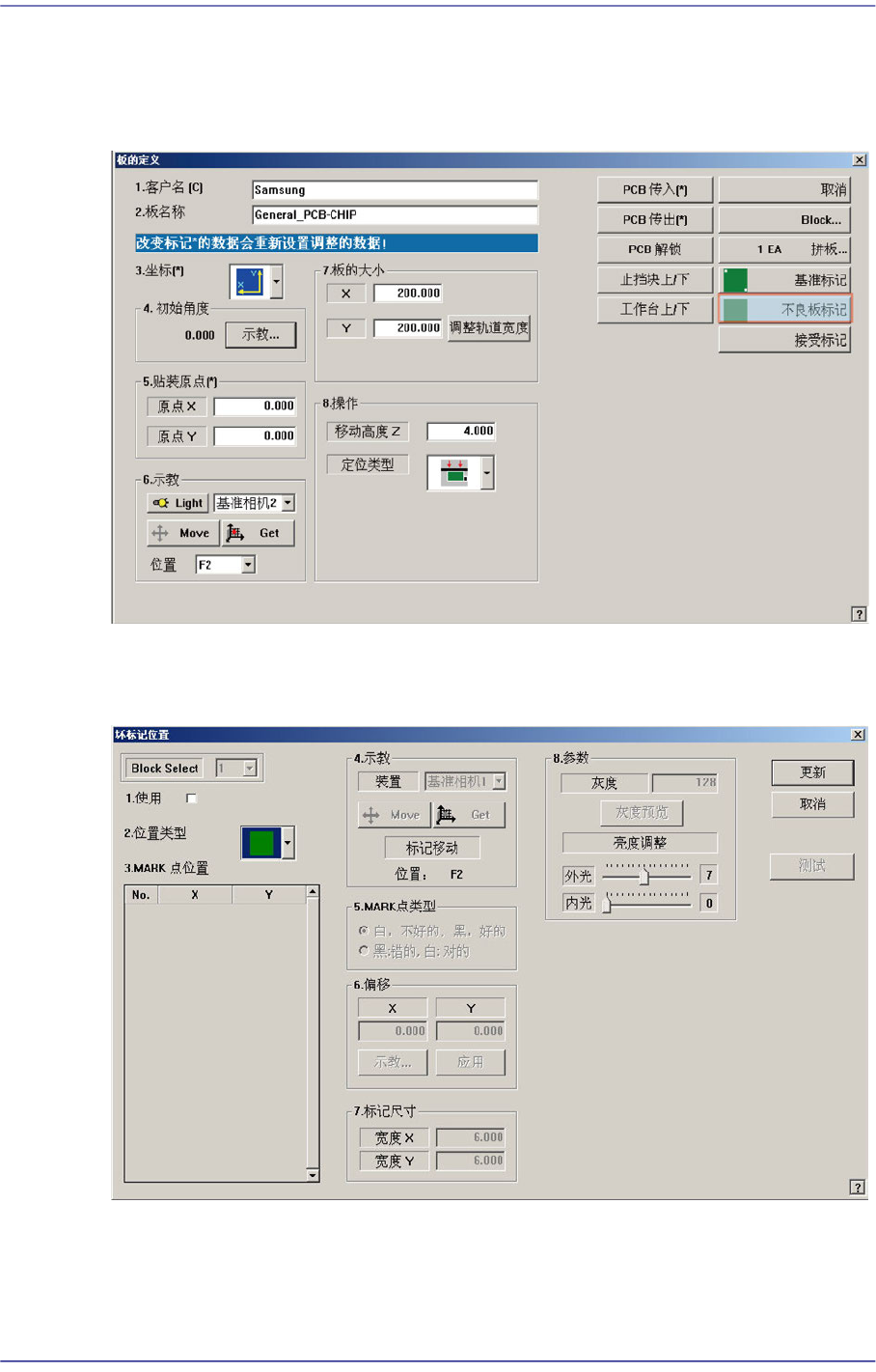 6-27 Board 定义 2) ‘ 位置类型 ’ 设置 3) ‘ 标记位置 ’ 设置 在 < 标记位置 > 领域选择基准标 点击 < 移动 > 按钮用 Fiducial camera 移动 到所选的基准标。 调节成基准标的中心与 SMV ision 窗的十字线中心一致 点击 < 登录坐标 > 按钮输入基准标坐标 4) ‘Shape’ 设置 5) ‘ 形状数据 ’ 设置 6) 确认轮廓线 点击 <…