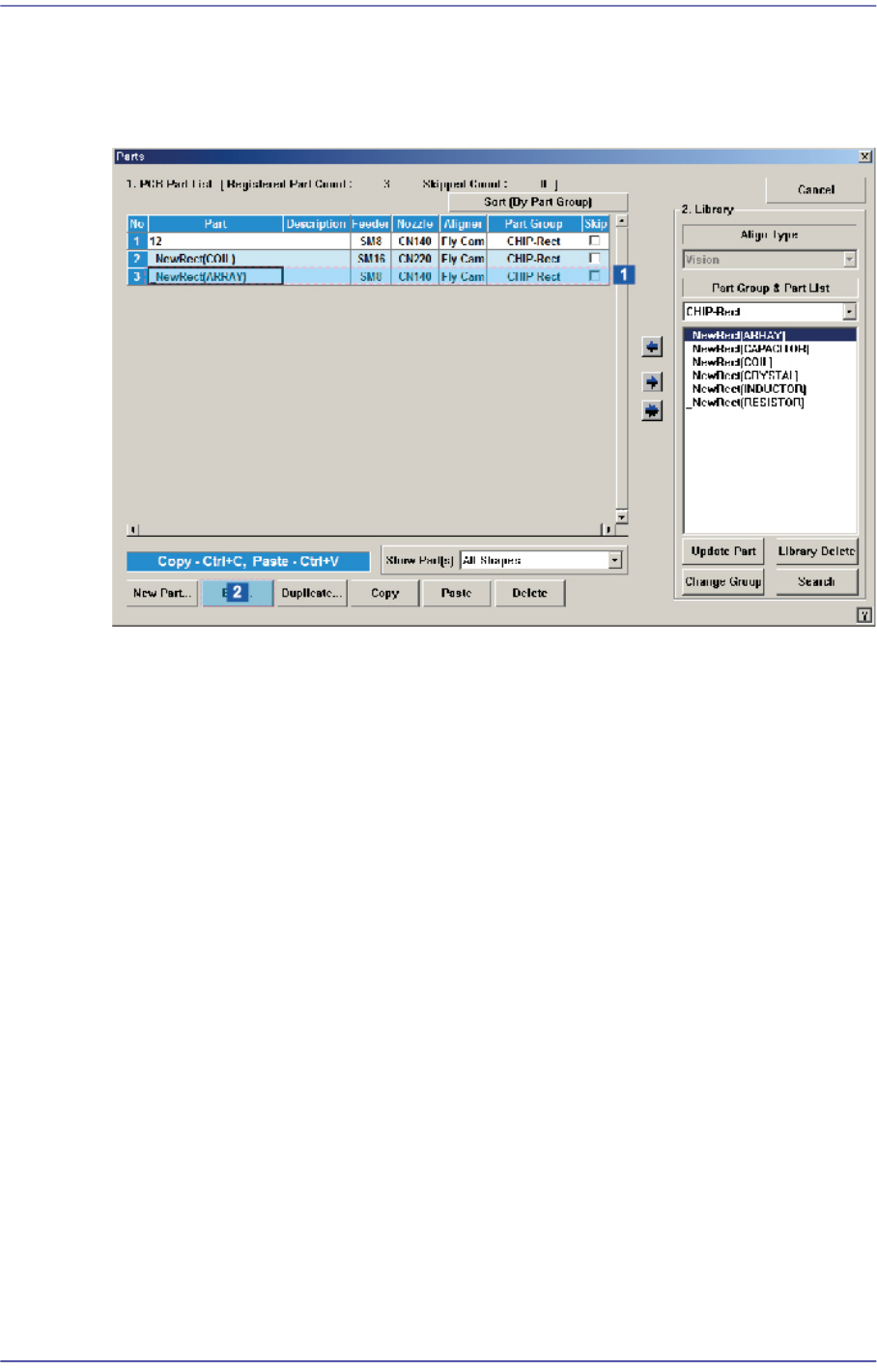 7-8 Fast Flexible Placer SM481(L) PLUS Administ rator’s Guide 7.2. 标准元器件的编辑登记 编辑标准元器件后登记元器件的方法。 在 <1. PCB Part List> 上选择需要编辑的元器 件后按下 < 编辑 > 键。