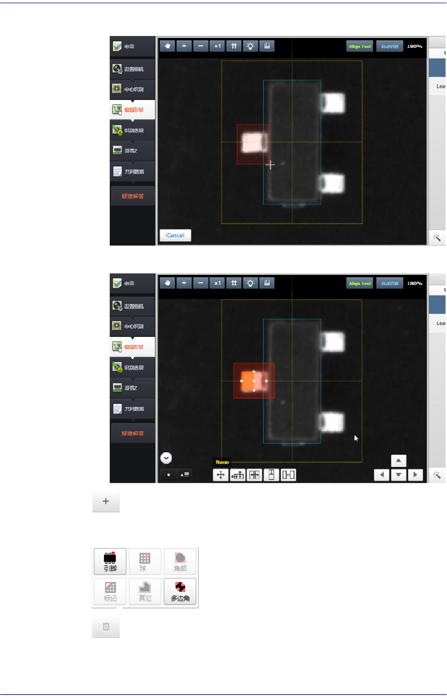 7-45 元件的登记 / 引脚以本体为基准位于左边或右边时增加 / 减少 增加 / 减少角部的宽度 “ 按钮 ” 菜单 实行局部自动识别、 添加实体、 复制实体、 删 除实体、 实体群化。 按钮 在使用者于视觉窗选择的领域内局部地自动识别元件形状。 1) 选择需要添加的形状实体 (Lead)