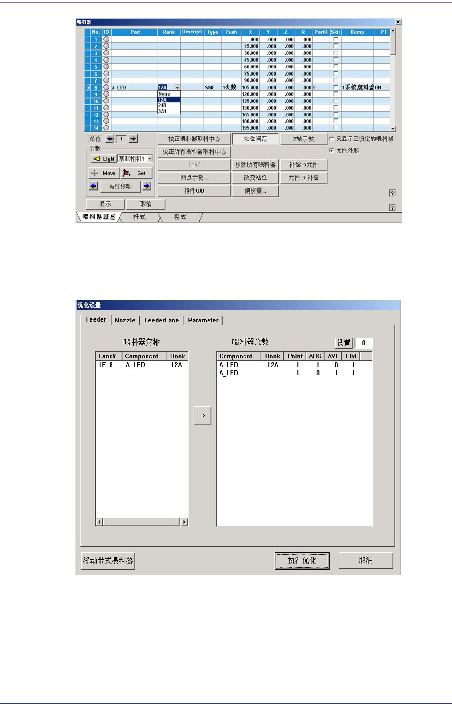 12-8 Fast Flexible Placer SM481(L) PLUS Administ rator’s Guide 使用 Rank 功能时, 即使 是 同一元件也会根据 Rank 而视为不同元件后进行处理, 因此在 “ 装贴登记 ” 对话窗口登记装贴点时不仅需要设定元件名称, 还要设定使 用该 Rank 元件的喂料器, 使用优化程序时也需要另外 设定该 Rank 的喂料器后再 进行优化。