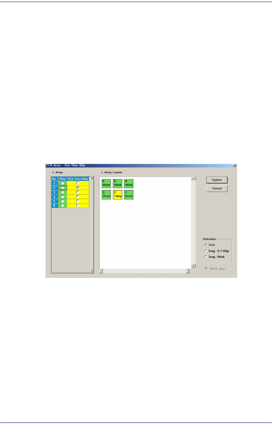 13-6 Fast Flexible Placer SM481(L) PLUS Administ rator’s Guide Monitor ’tap 对话框中点击 <One Ti m e Skip> 按钮。 <2. Array Layout> 领域 在此处可利用鼠标选择 Array PCB 内的小型 PCB , 显示小型 PCB 当前设定的 作业有无状态。 <Selection> 选框领域 …