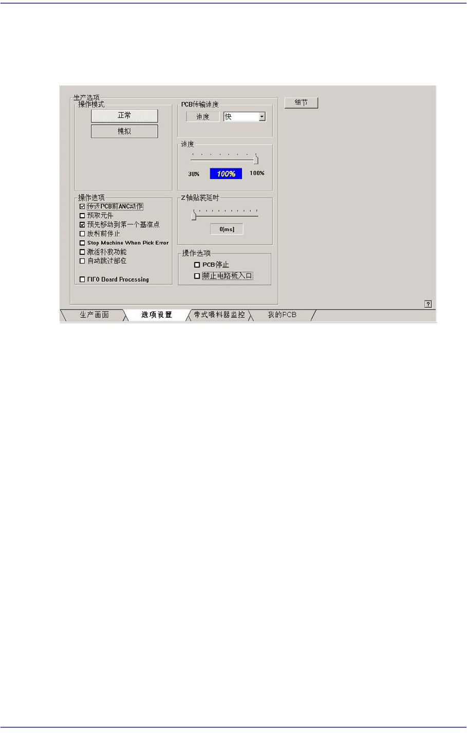 13-7 Production Setup 13.1.2. 运行设定 以图表的形式表示 PCB 投入到输送机的情况, 以百分比的形式表示 PCB 的作业进程 图 13.4 “ 运行设定 ” TAP 对话框 < 操作模式 > 领域 设置驱动 Mode 。 可选择的 M ode 如下。 正常 模式 执行实际部件吸附及贴装作业。 模拟 模式 不进行对实际部件的吸附及贴装, 而是 选择以下的假想条件执行作业。 此菜 单仅…