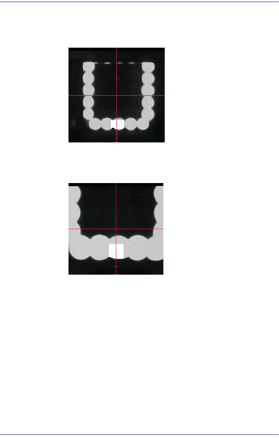 14-14 Fast Flexible Placer SM481(L) PLUS Administ rator’s Guide 5) 利用 T e aching Bo 移动 M irror 轴, 使该 Camera 的 LED 中央下端位于 SMV ision’ 窗口 屏十字线下端的第四个刻度。 <FOV 25mm Fly Camera 时 > 如果是 FOV 2 5mm 飞行 相机, 则把 LED 下端对准 SMV isi…