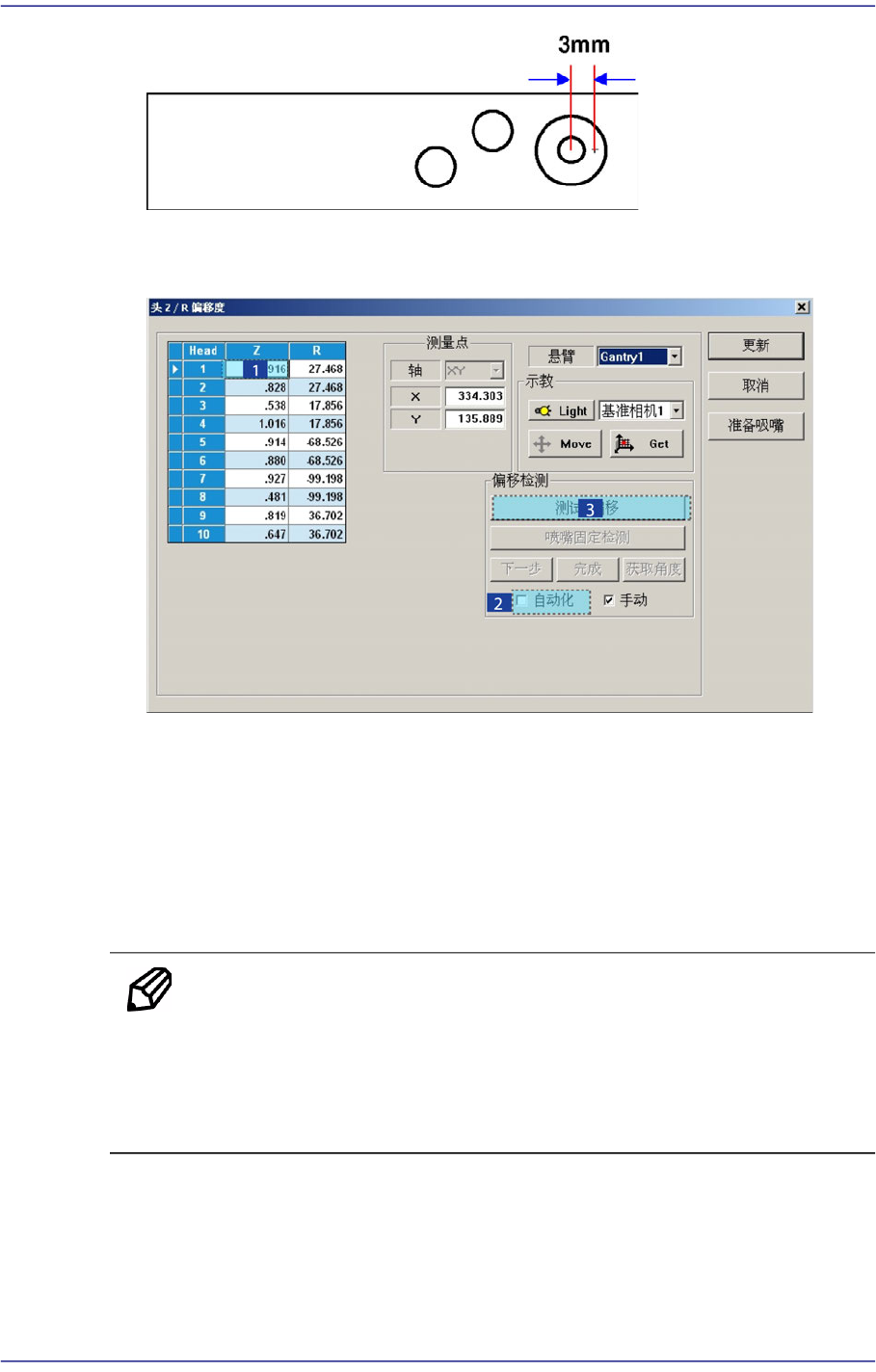 14-55 Machine Cal ibration 2. 在 <Grid> 领域中选择执行校正的 Head Z 轴后, 选择 <Aut o matic> 校验框, 之后 点击 <Detect Z Off set> 按钮。 (在此任意设置成 Head1 ) 3. 那么 Head 会自动移动到 ANC 上的指定位置。 之后设备产生空压从 H ead1 号开始 到 Head10 依次自动下降 Spindl…