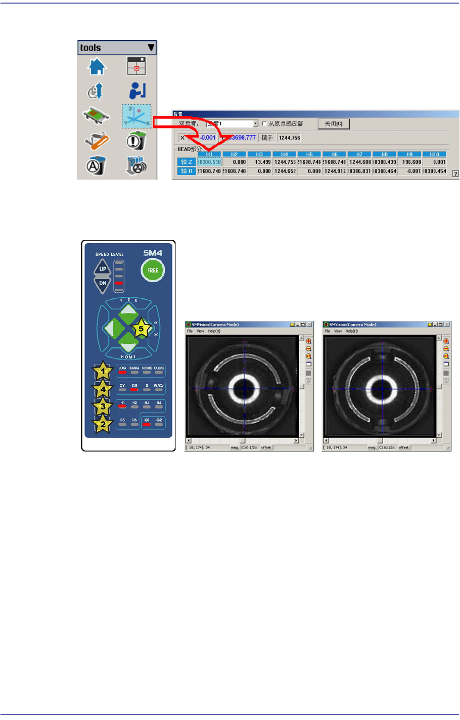 14-57 Machine Cal ibration 5. 打开 < 当前位置 > 窗口。 6. 利用示教盒使吸嘴座形状成 '( )' , R 轴方 向旋转转轴。 此时, 机械连动的磁头 . 吸 嘴座朝相同方向。 即如上图所示利用齿垢 1~2 号, 3~ 4 号, 5~6 号, 7~8 号, 9~10 号磁头器具上应组 装为相同的组装方向。
