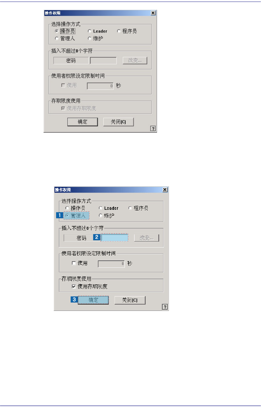 注 意 请勿与其他用户共享程序员方式及管理员方式的密码。 无权限
