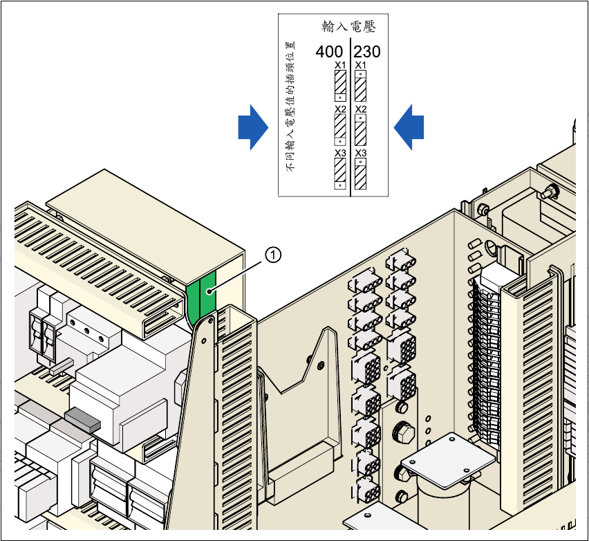 X1, X2, X3 設定衝擊電流限制的接頭