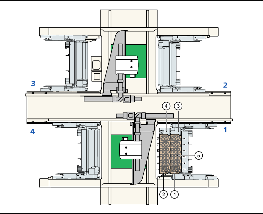 SIPLACE HF 使用手冊 7 夾爪工作站擴充 軟體版本 SR.504.xx 07/ 2003 ㆗文版 7. 1 吸嘴更換器 283 7. 1 .2. 2 位置 7 圖 7. 1 - 9 6 取置節 / 取置頭的吸嘴更換器的位置 7 ( 1 ) 吸嘴更換器 no. 1 (2) 吸嘴更換器 no. 2 (3) 廢元件回收筒 (4) 吸嘴棄置裝置及回 收筒 (5) 吸嘴匣 7 7 7