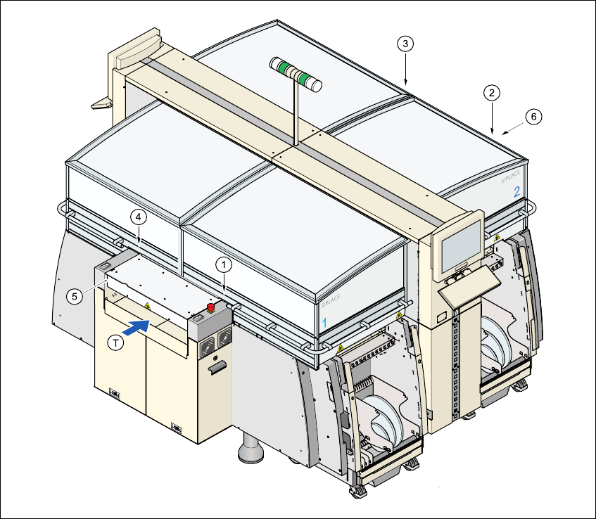 2 操作安全須 知 SIPLACE HF 使用手冊 2.6 安全 配備 軟體版本 SR.504.xx 07/2003 ㆗文版 56 2 圖 2.6 - 4 開關與按鈕位置-由 PCB 輸入側檢視 2 ( 1 ) 輸入側㆖的緊 急停機按鈕 (2) 輸入側的起動 鈕 ( 白色 ) (3) 輸入側的停止 鈕 ( 白色 ) (4) 壓縮空氣單元 側操作面板㆖ 的啟動鈕 ( 白色 ) (5) 壓縮空氣單元 側操作面板㆖ 的停止鈕 ( 黑色 ) (…