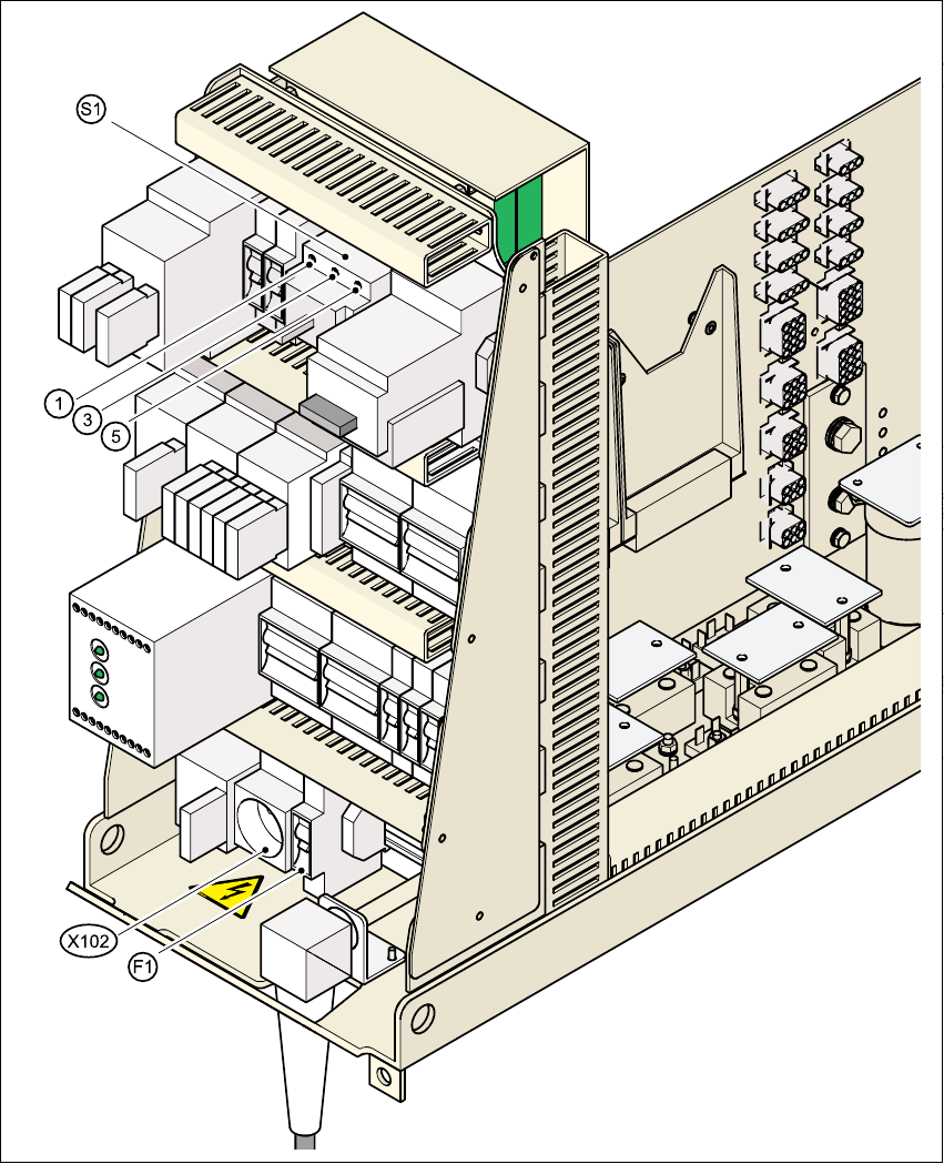 - 連接總電源開關 Q1㆗的端子L1、L3 及 L5 的纜線 ( 參閱圖 2.9 - 4)