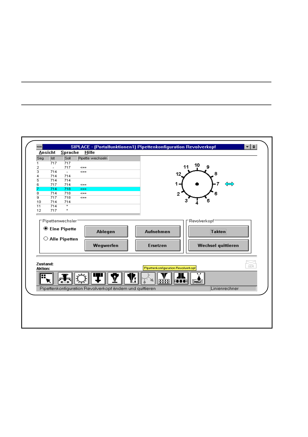 Bei Aktivierung dieser Funktion kann eine bestimmte, am Revolverkopf befindliche Pipette, in das jeweilige