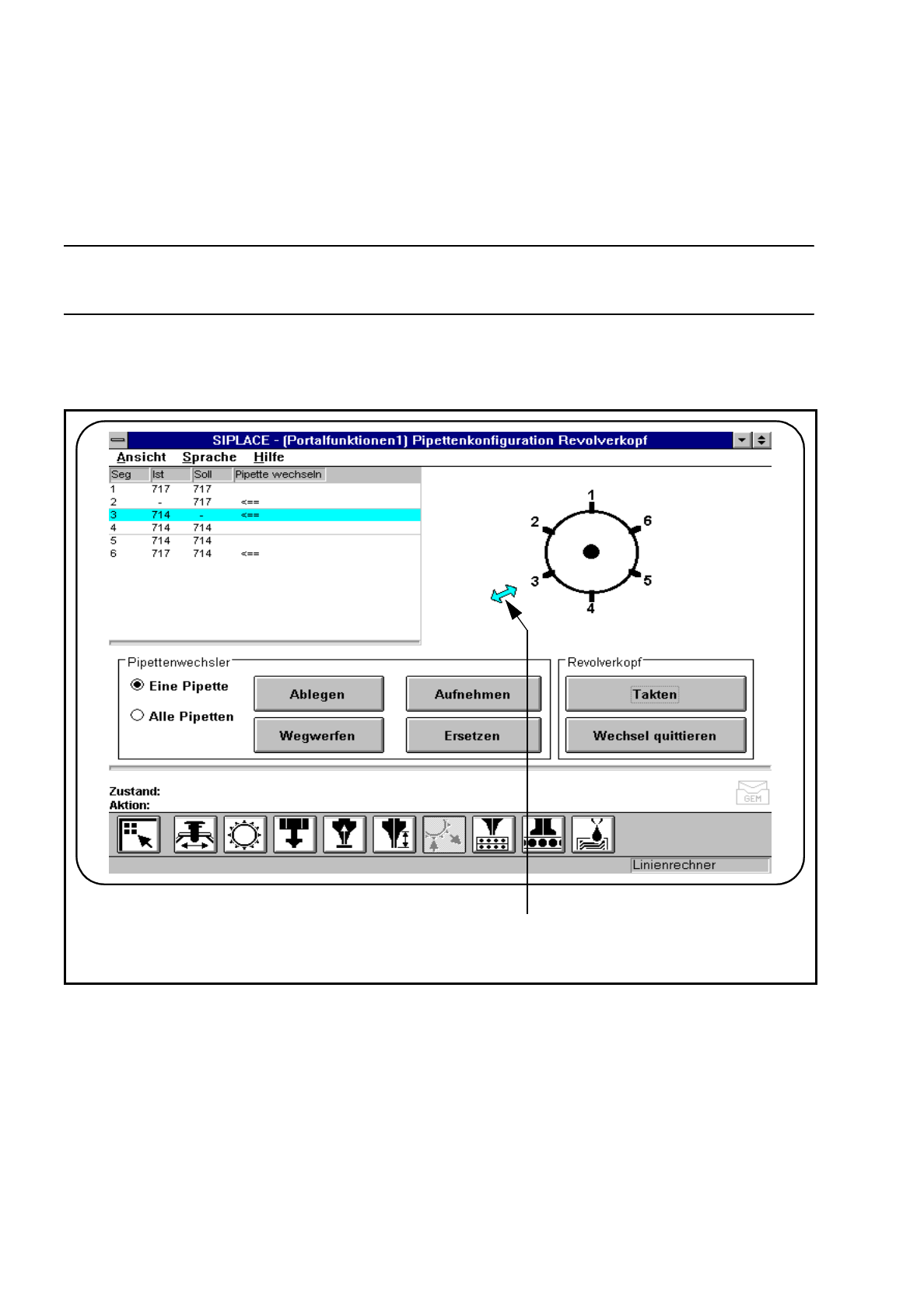 Bei Aktivierung dieser Funktion kann eine bestimmte, am Revolverkopf befindliche Pipette, in das jeweilige