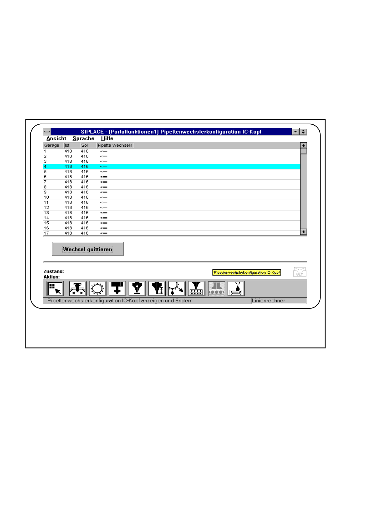 In der Spalte "Ist" steht die tatsächliche Rüstung am Pipettenwechsler.