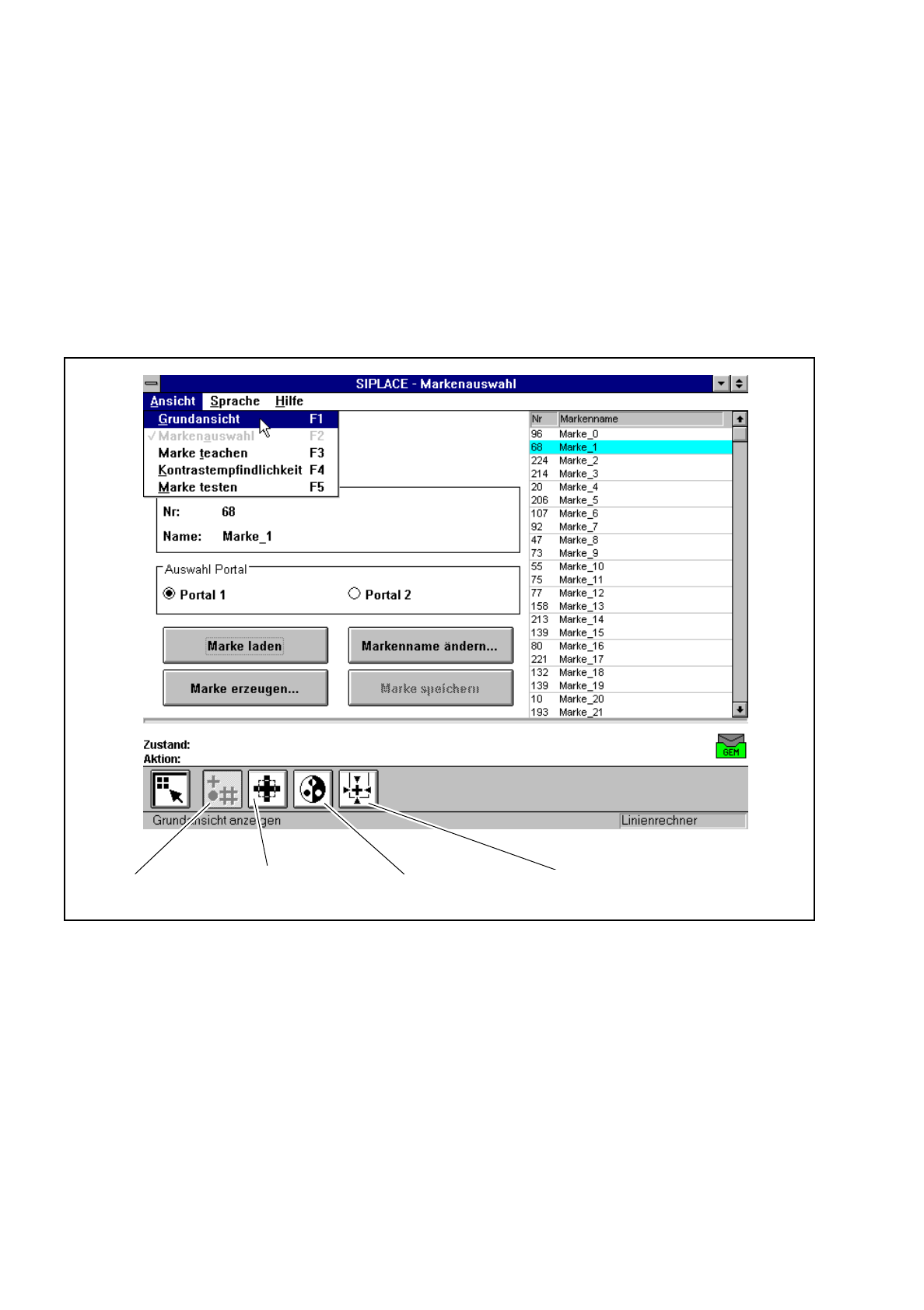 Folgende Menüs können Sie in der Option ’Marke teachen’ entweder über die Ikonen der Symbolleiste oder