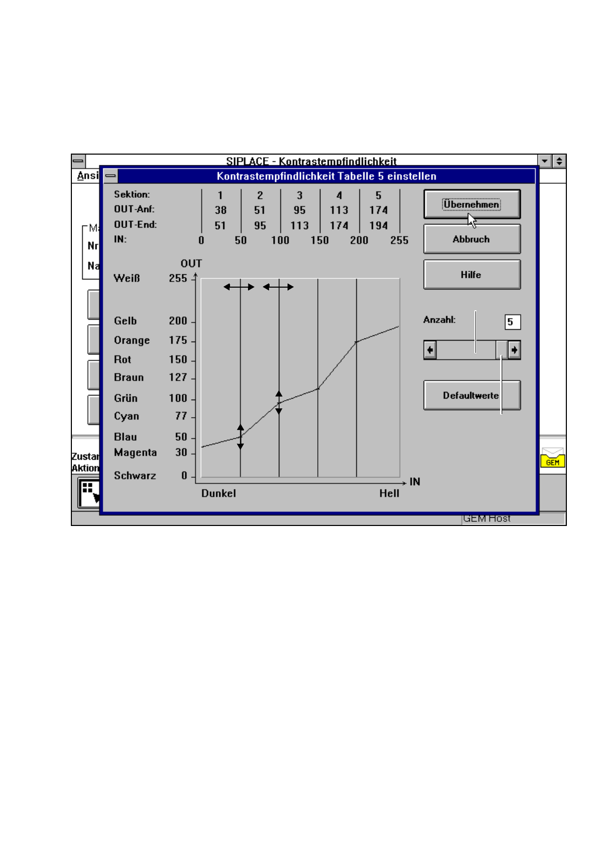 Positionieren Sie den Mauszeiger auf eine Sektionsgrenze mit Ausnahme von 0 und 255, so erscheint ein