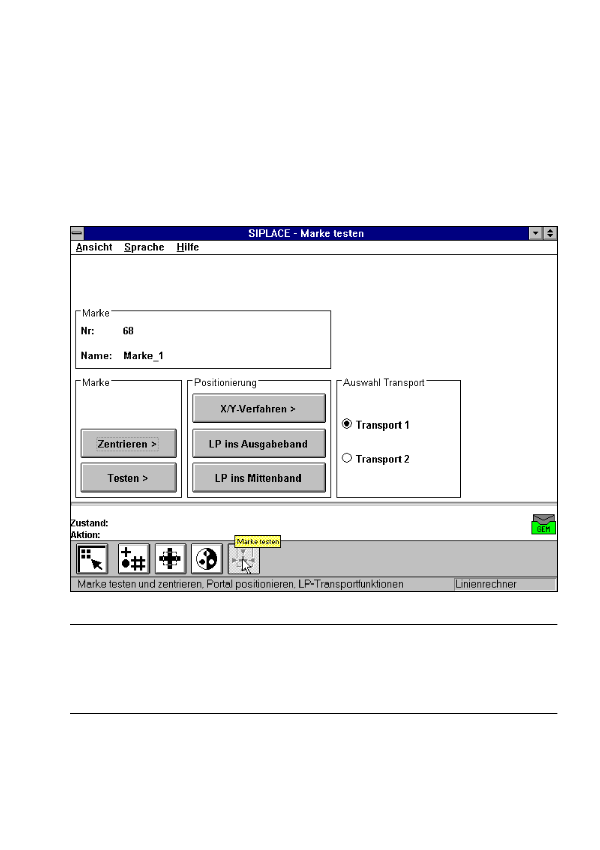 Wenn Sie die Schaltfläche ’Zentrieren’ anklicken, wird das Menü ’Marke testen’ weggeschaltet und das
