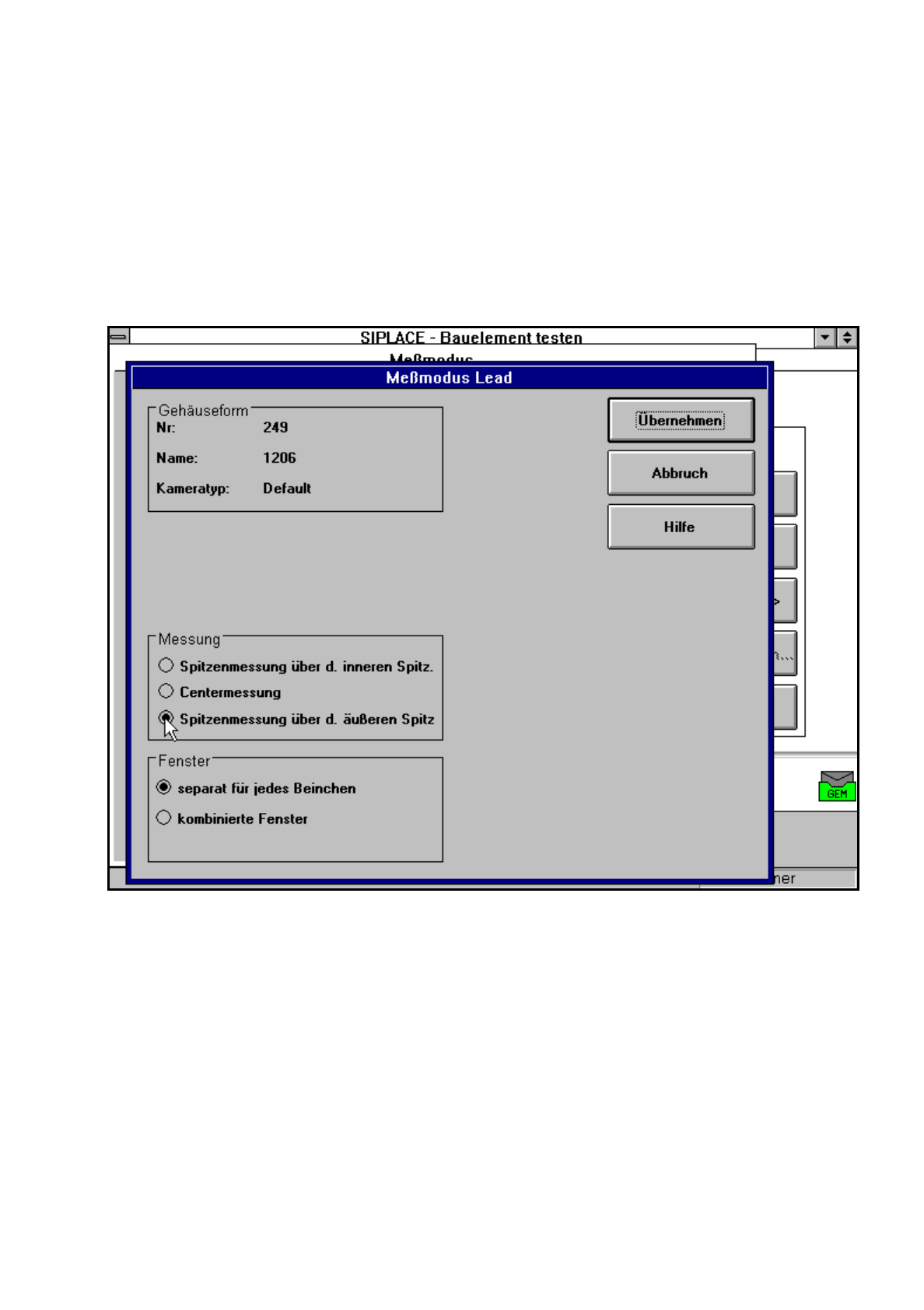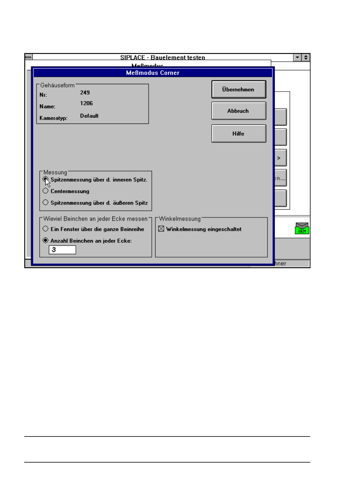 5 Visionfunktionen Betriebsanleitung SIPLACE 80S-20/F4/F4-6 5.6 Bauelement testen Ausgabe 07/97 ab Softwareversion SR.403.xx 5 - 110 Einric hter Abb. 5.6.30 Option ’Meßmodus’, Menü ’Meßmodus Corner’ In diesem Menü h aben…