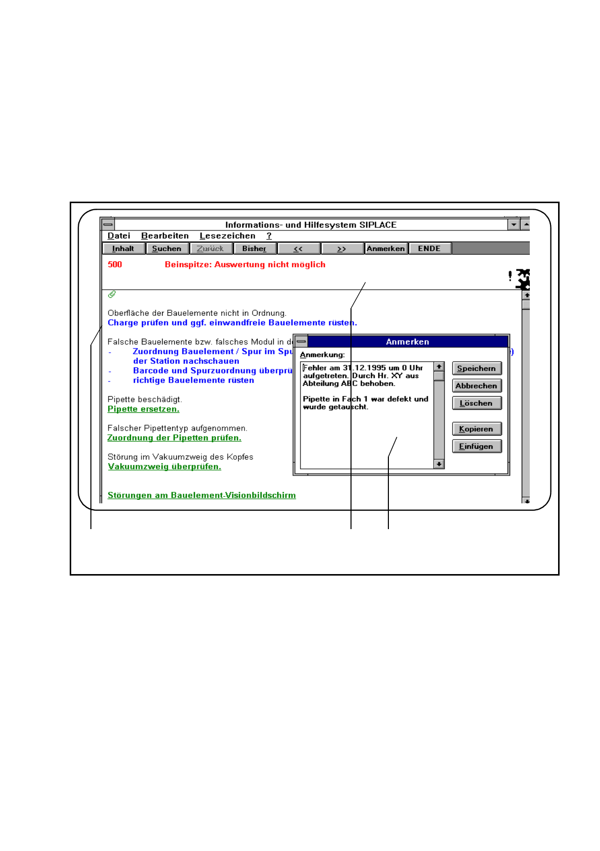 Betriebsanleitung SIPLACE 80S-20/F4/F4-6 7 Fehlerinfo und Diagnose Ausgabe 07/97 ab Softwareversion SR.403.xx 7.1 Fehlerinfo 7 - 7 7.1.1.1 Anmerkungen hinterlegen un d bearbeiten In jeder Ansich t könn en Sie A nmerkun g…