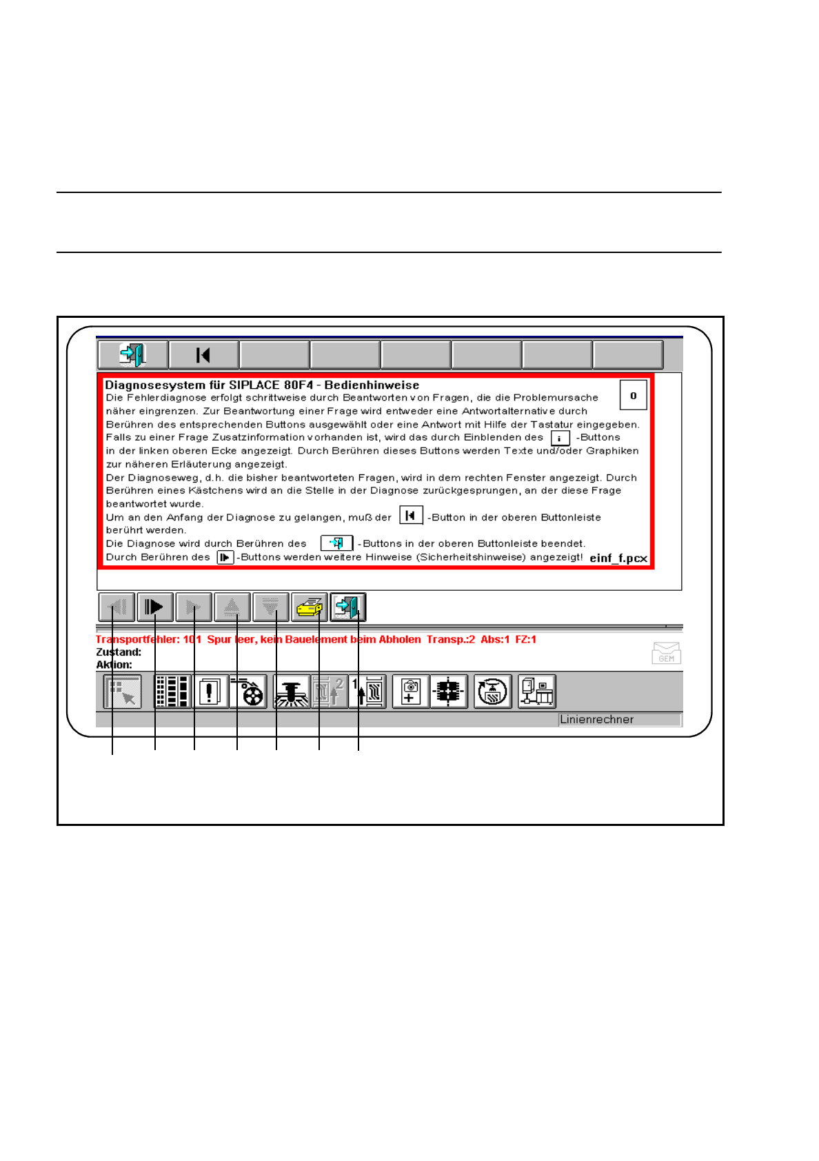 7 Fehlerinfo und Diagnose Betriebsanleitung SIPLACE 80S-20/F4/F4-6 7.2 Diagnose Ausgabe 07/97 ab Softwareversion SR .403.xx 7 - 12 7.2.2.1 Info Button ● Falls Info rmatione n zu b estim mten Menüs vorhan den sind, wird d…
