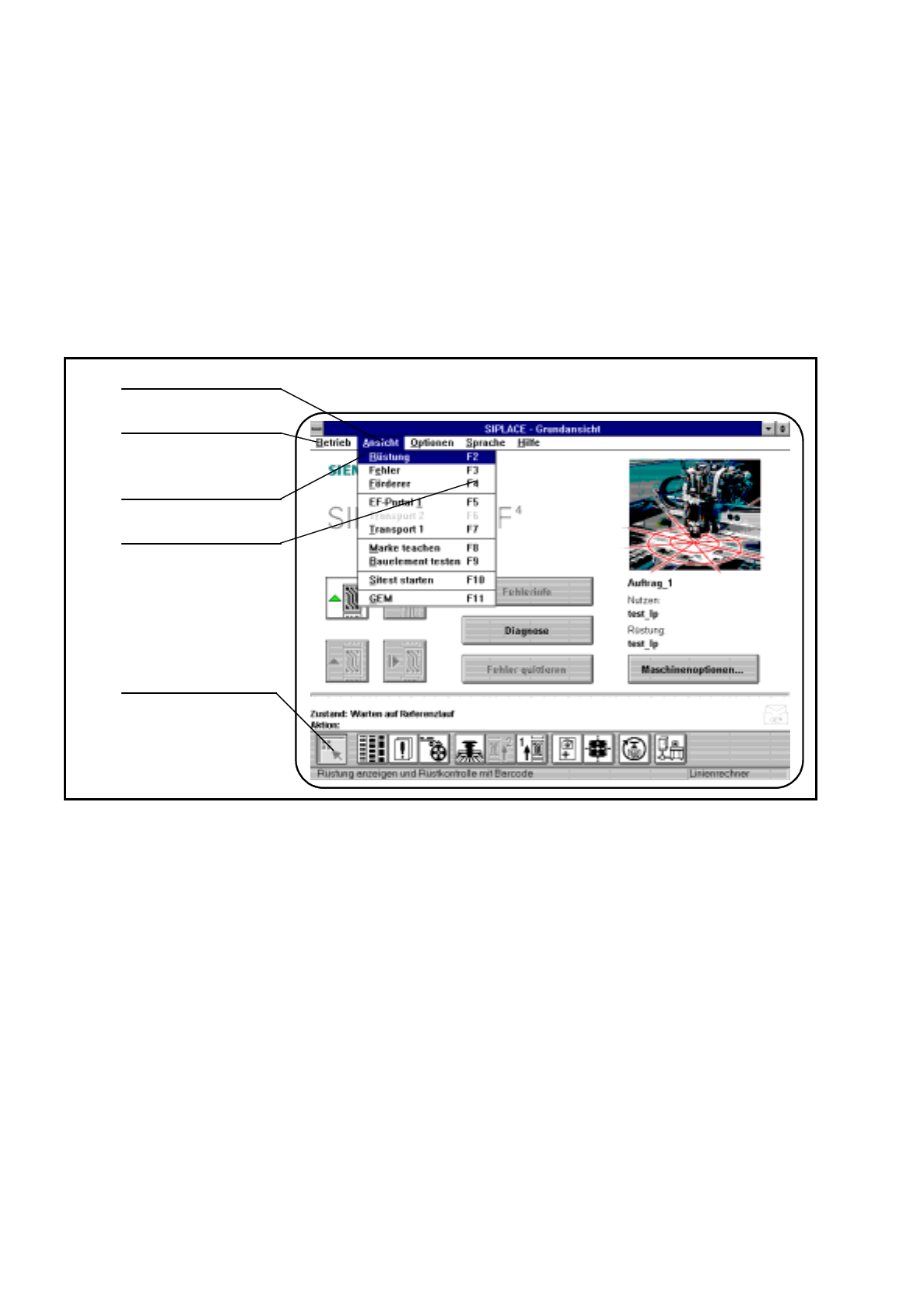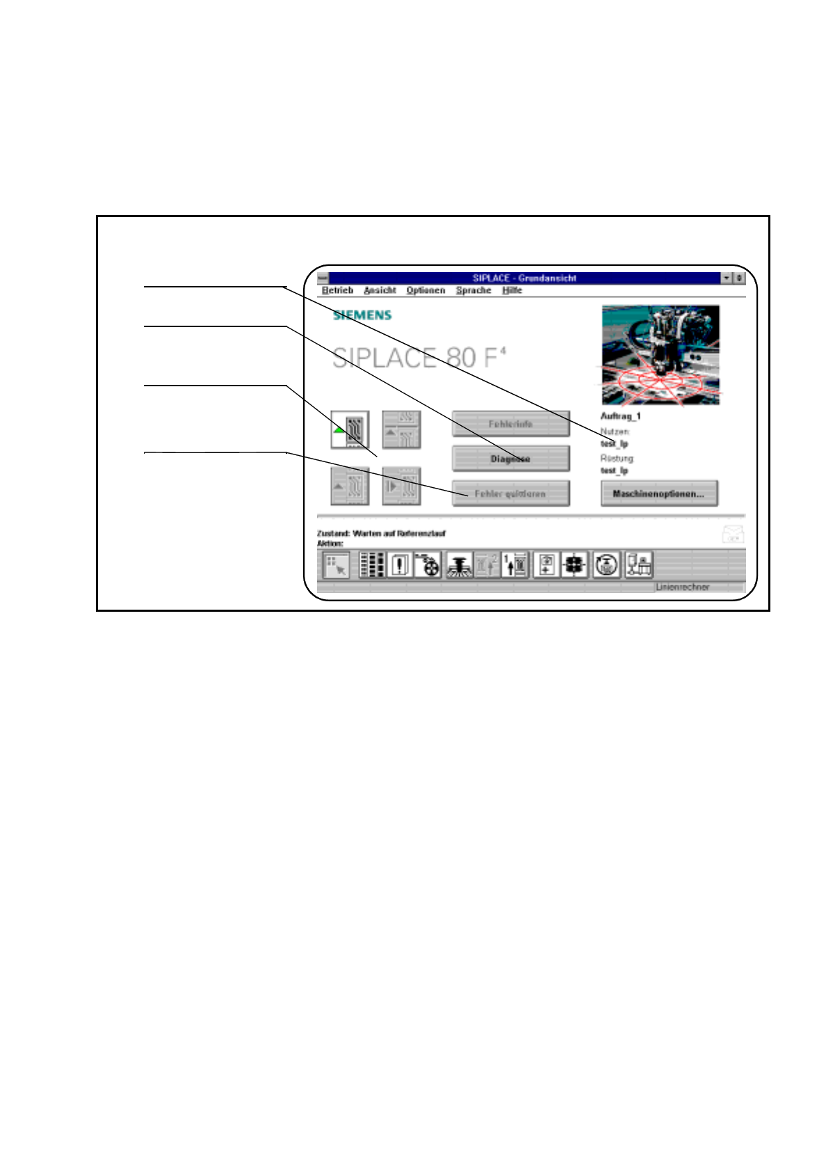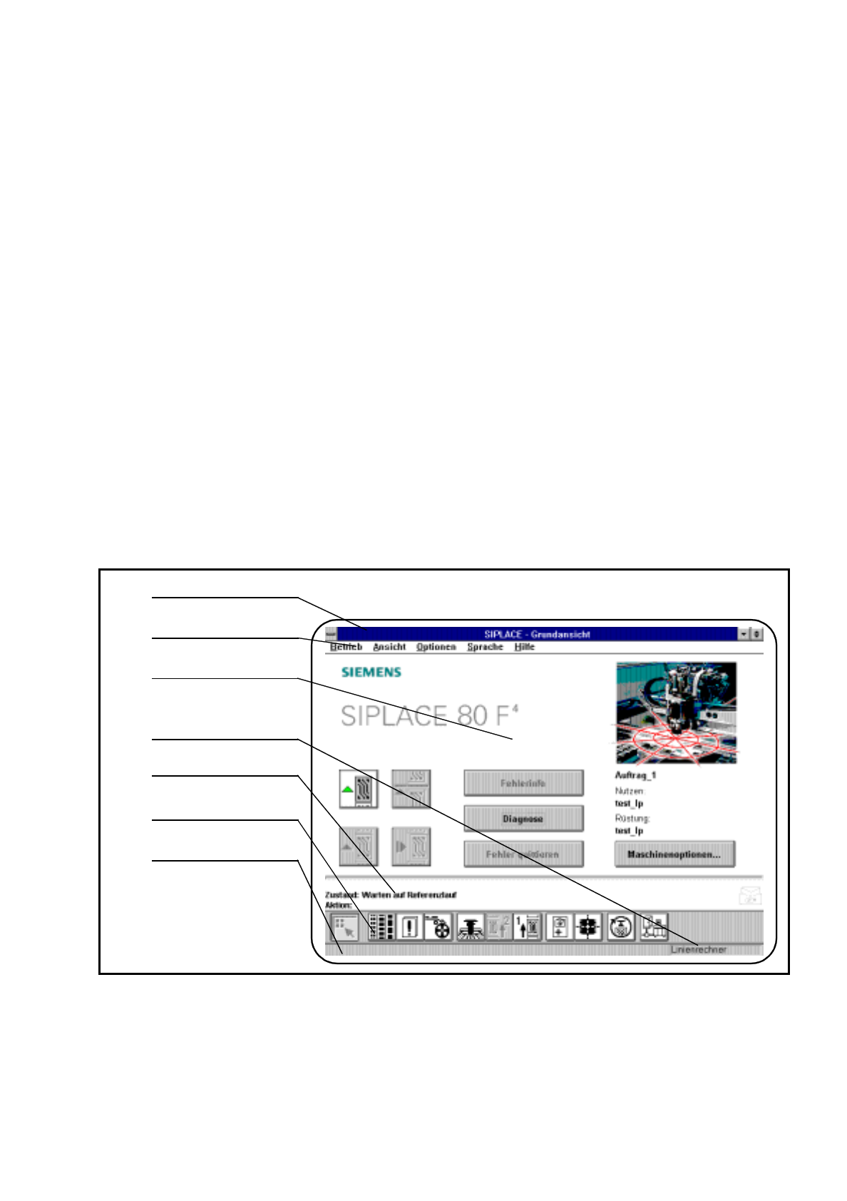 2 Einführung und Grundbegriffe Betriebsanleitung SIPLACE 80S-20/F4/F4-6 2.2 Grundlagen und Aufbau der Bedienoberfläche Ausgabe 07/97 ab Softwareversion SR.403.xx 2 - 12 2.2. 2.1 Titelbalken Der Titelb alken zeigt de n Ma…