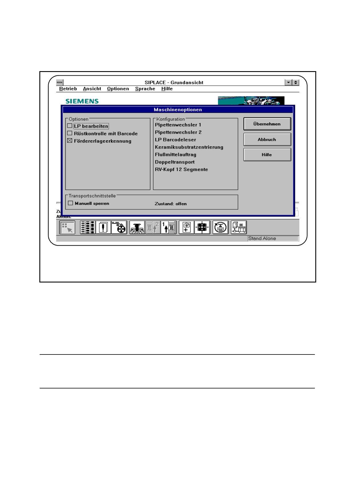 2 Einführung und Grundbegriffe Betriebsanleitung SIPLACE 80S-20/F4/F4-6 2.4 Kurzbeschreibung und Grundlagen der Bedienoberfläche Ausgabe 07/97 ab Softwareversion S R.403.xx 2 - 34 2.4.4 Das Menü „Optionen“ Hier find en S…