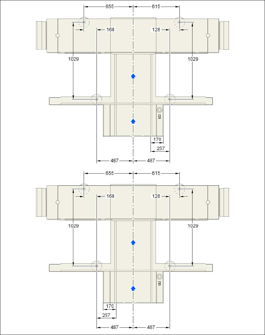 Fig. 4.3 - 3 Machine foot clearances and the stationary right and left conveyor edge for the PCB single conveyor in