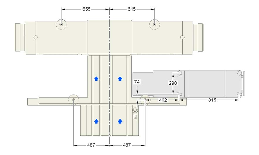 Fig. 4.3 - 4 Machine foot clearances and the stationary right and left conveyor edge for the PCB dual conveyor in mil-