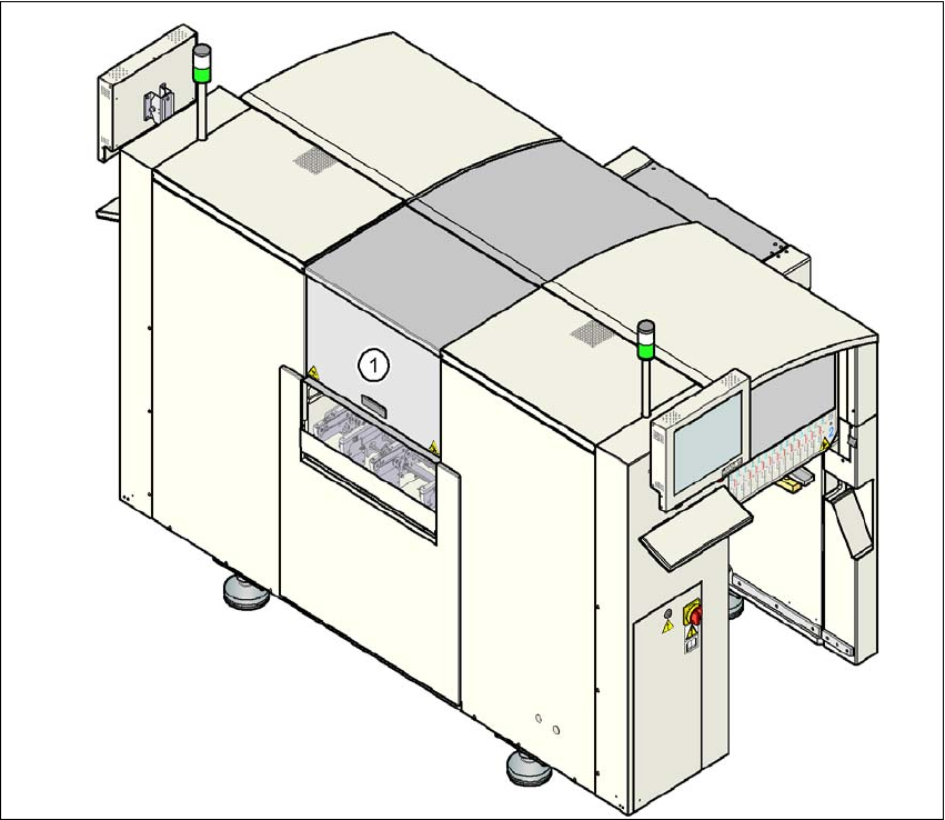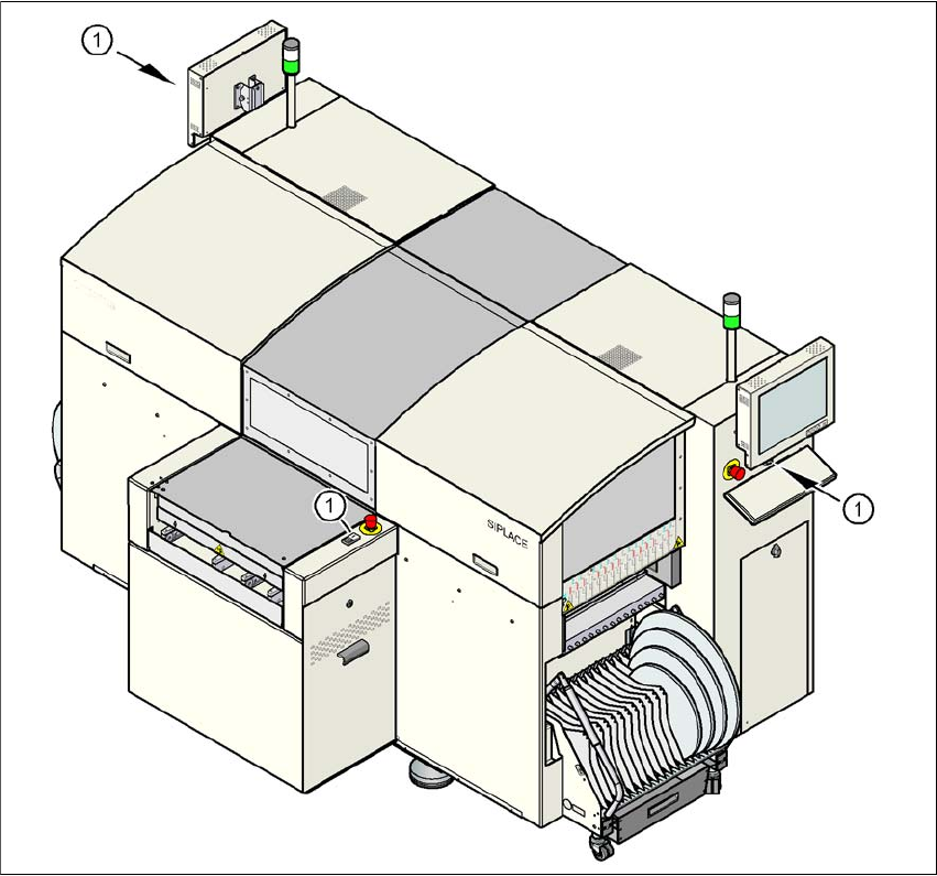 2 Operational safety User Manual SIPLACE D1/D2 2.6 Safety equipment From software version SR.605.xx 07/2008 EN Edition 68 2 Fig. 2.6 - 3 Position of the start button (white) on the machine (1) S tart button ( white) on t…