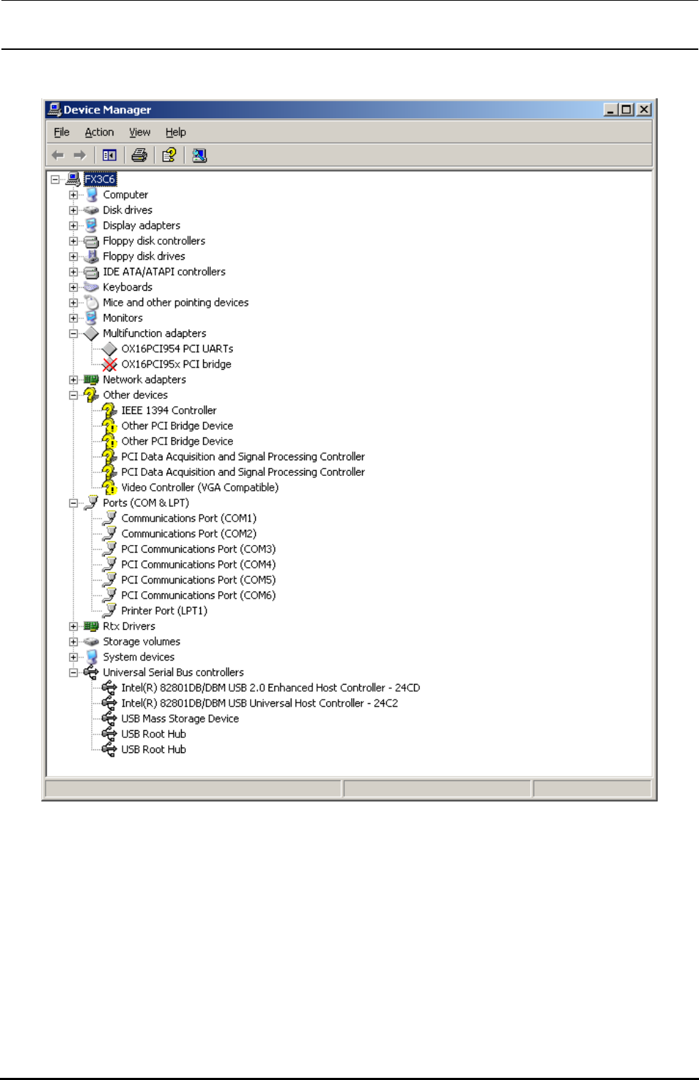 29) 图的 Device Manager画面被显示以后,右击“Multifunction Adapters”中的“OX16PCI95x PCI bridge”,
