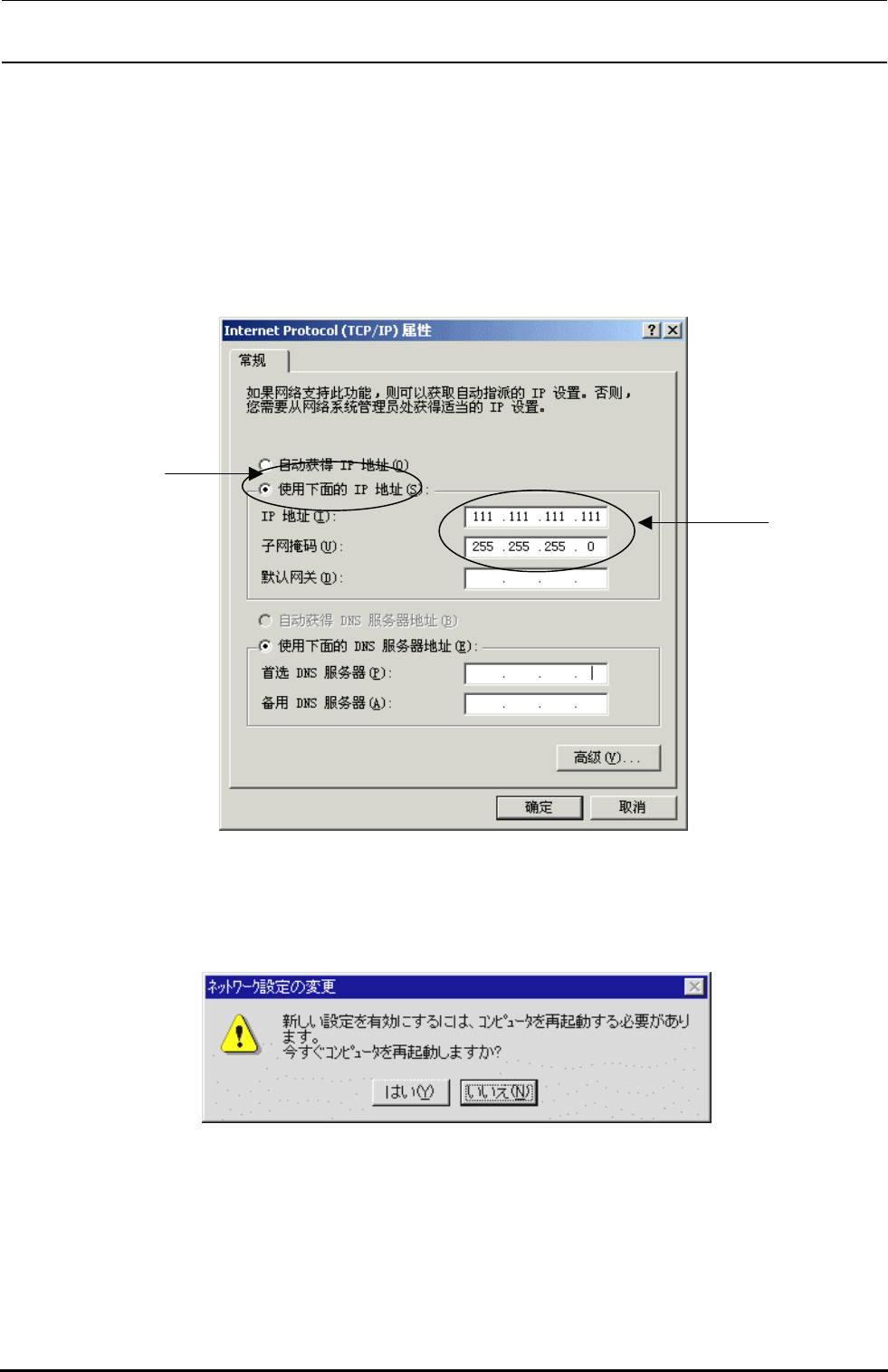 下面的 IP 地址(S)”,并指定②[IP 地址]、[子网掩码]。关于 IP 地址。有公司内部规定时,请