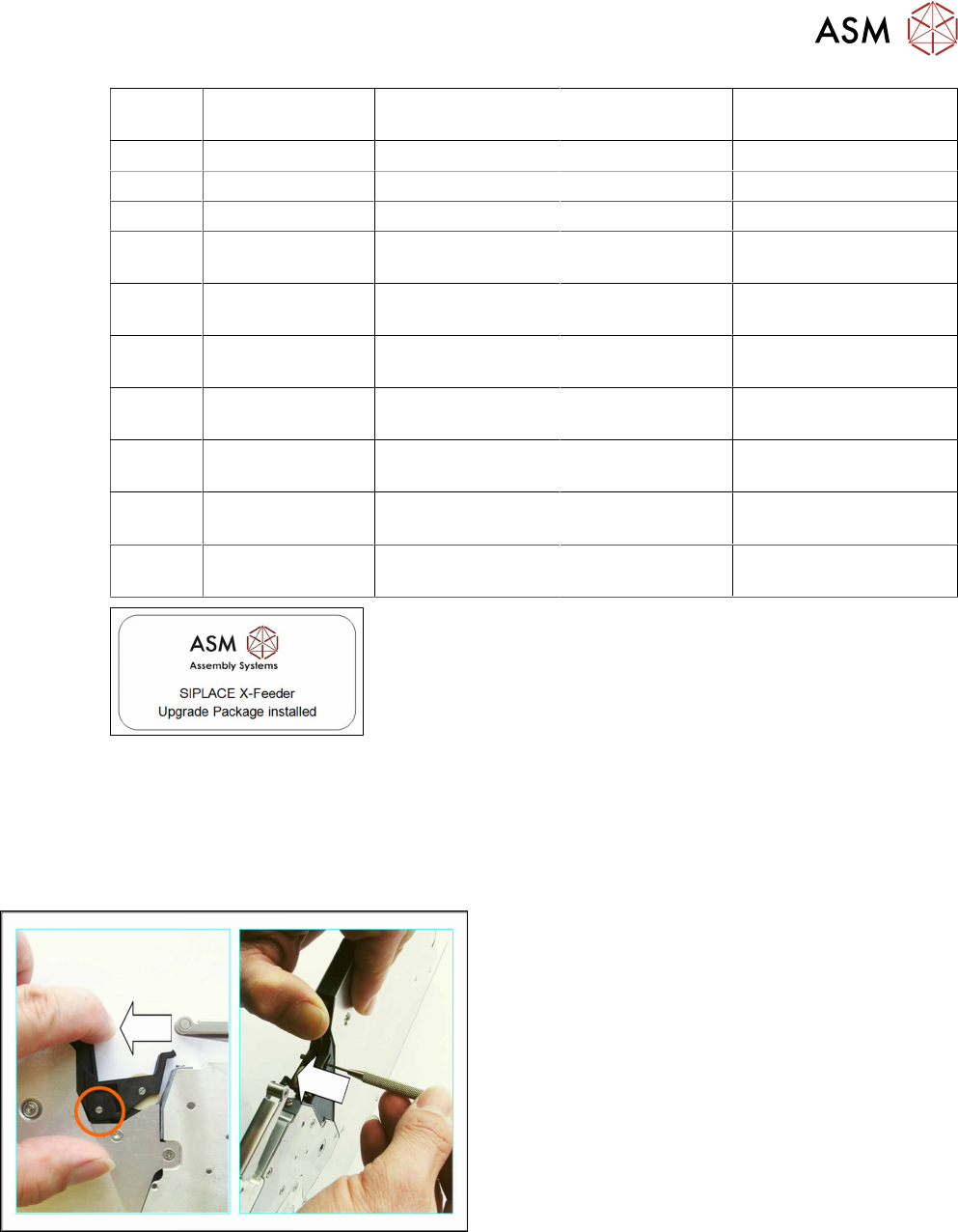 6 Repairing the X Feeder modules 6.6 Rocker Service Manual SIPLACE X-Feeder 4 - 88 mm 11/2017 69 Feeder module Item no. Module Version <= -06 Item no. Module with upgrade kit Item no. Module Version >= -07 Designat…