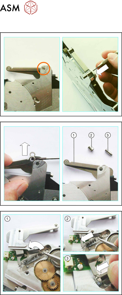 6 Repairing the X Feeder modules 6.5 Foil Disposal 54 Service Manual SIPLACE X-Feeder 4 - 88 mm 11/2017 6.5.4.1 Removing the Foil Rocker (4 - 88 mm) ► Place the feeder module down on its left side. ► Loosen the bearing s…