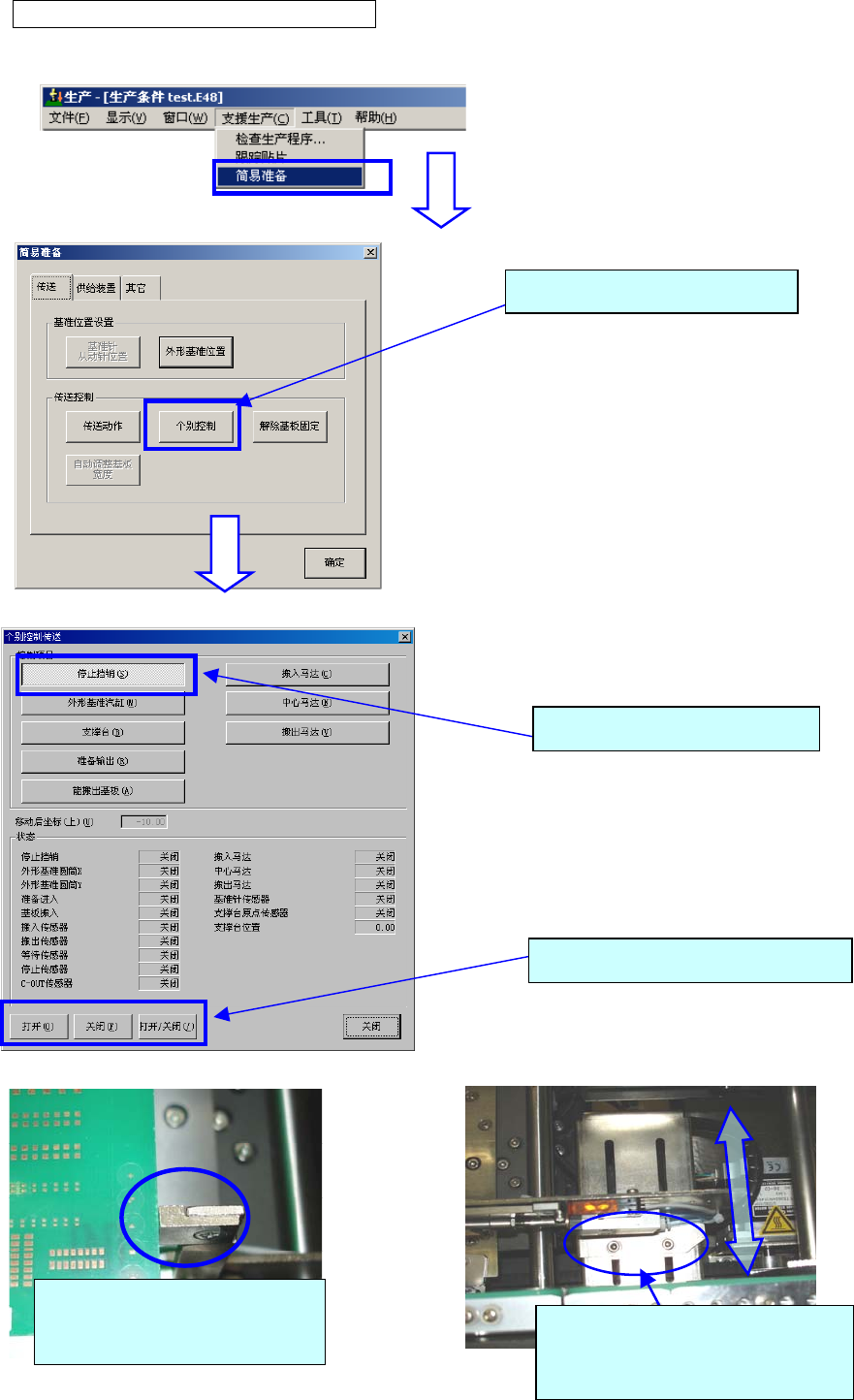 ③ 显示个别控制传送画面。选择「停止挡销」,按下「打开」,停止挡销即会立起来。