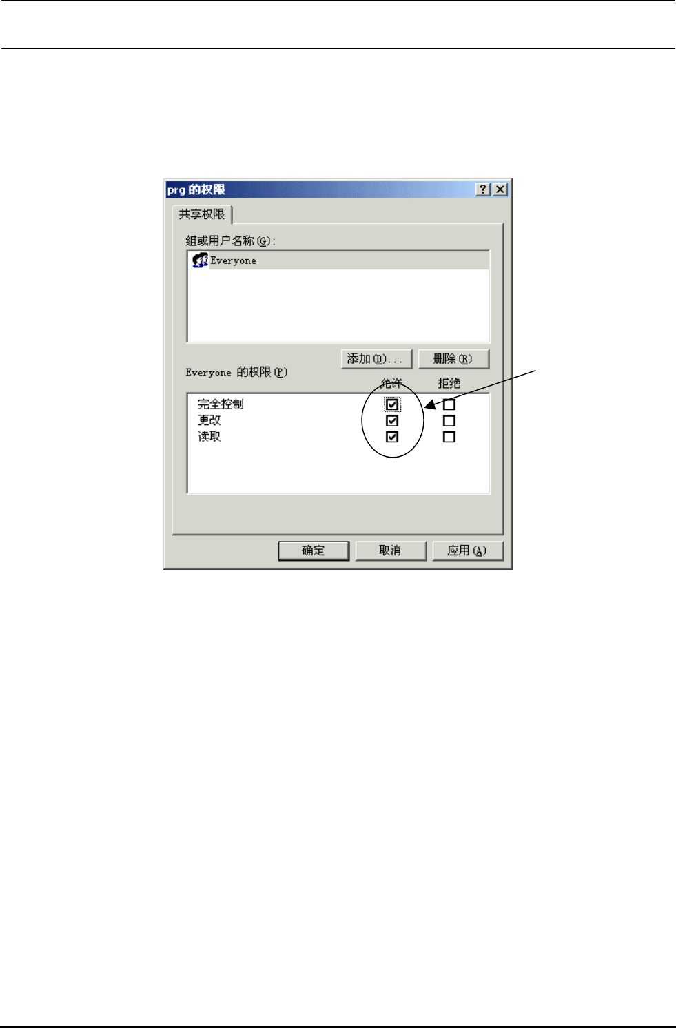 7)在上述画面中,请选择③<权限(P)>按钮,以显示「prg 的权限」对话框。这里,在 everyone 的权