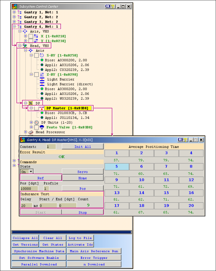 Hier können Sie z.B. die Referenzläufe bzw. einen Dauerlauf aller DP-Achsen eines C&P20 Kop-