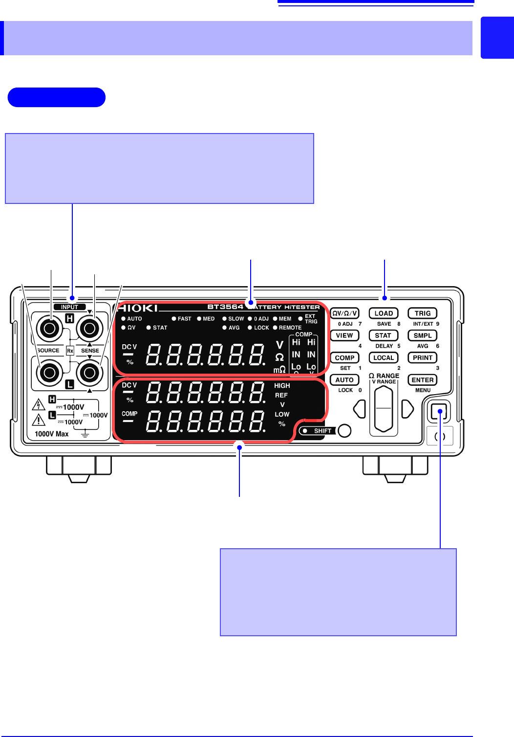 1.3 各部分的名称与功能 10 显示区主画面 显示测量值或设定项目 (上段) AUTO 在自动量程下测量时点亮 FAST, MED, SLOW 设定的采样速度点亮 0 ADJ 在执行调零后的量程下测量时点亮 MEM 存储功能 ON 时点亮 EXT TRIG 选择外部触发时点亮 (下段) Ω V 为 Ω V 功能 (电阻和电压测量)时点亮 STAT 统计运算功能 ON 时点亮 AVG 在平均值功能 ON 的状态下测量时点亮 LOCK 按…