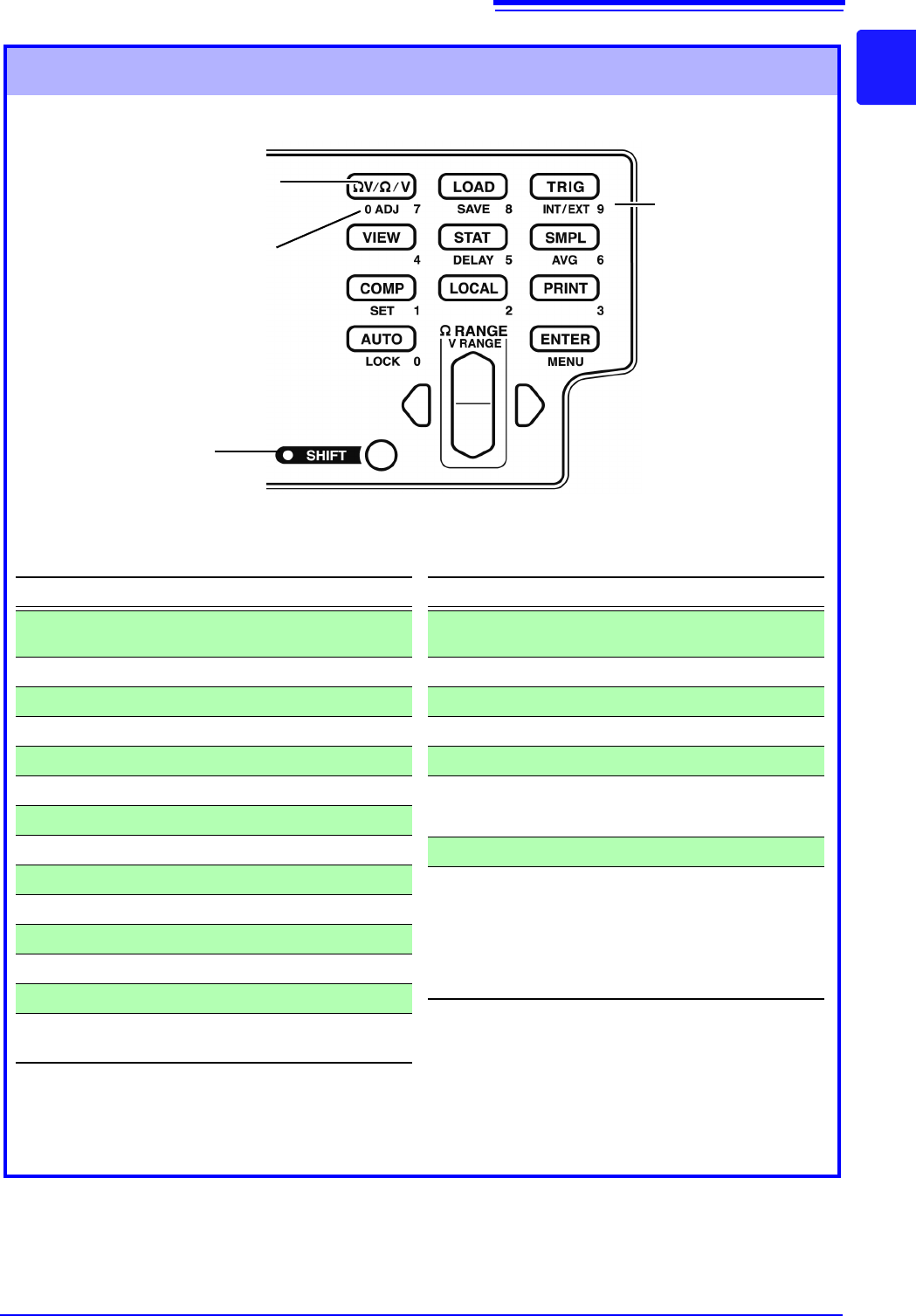1.3 各部分的名称与功能 11 1 操作键 使用按键上的功能时直接按下。 使用按键下部 (蓝字)的功能时, 先按下 SHIFT 键 (确认 SHIFT 指 示灯点亮) ,然后按下该键。 SHIFT 指示灯 设定数值时,可用作数 字键。 (也可以使用 RANGE 键进行数值设定) [ ] :按下 SHIFT 键时 ( SHIFT 指示灯点亮)有效。 操作键 内容 Ω V/ Ω / V 选择测量功能 (电阻和电压同时测量, 电阻、电压分别…