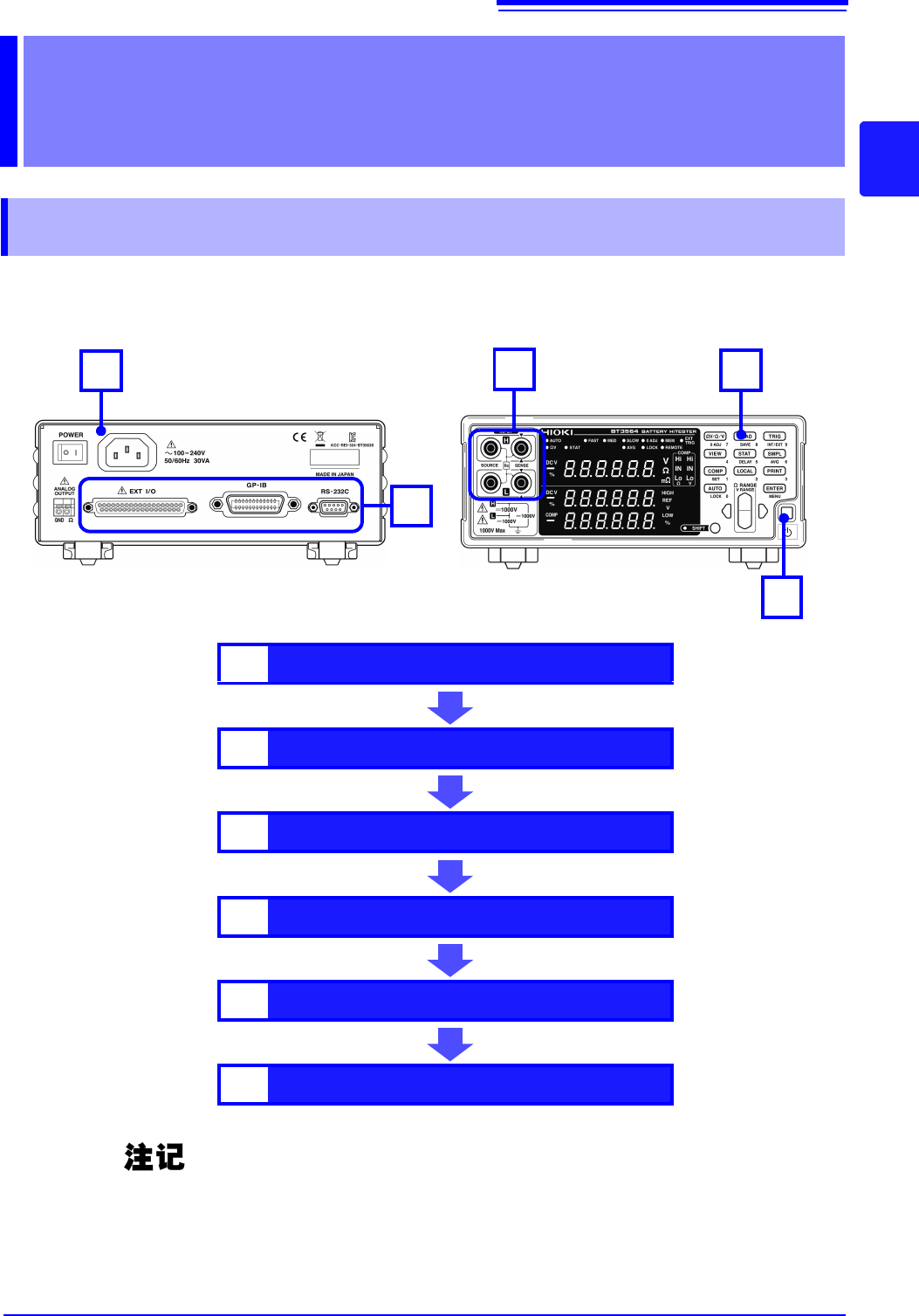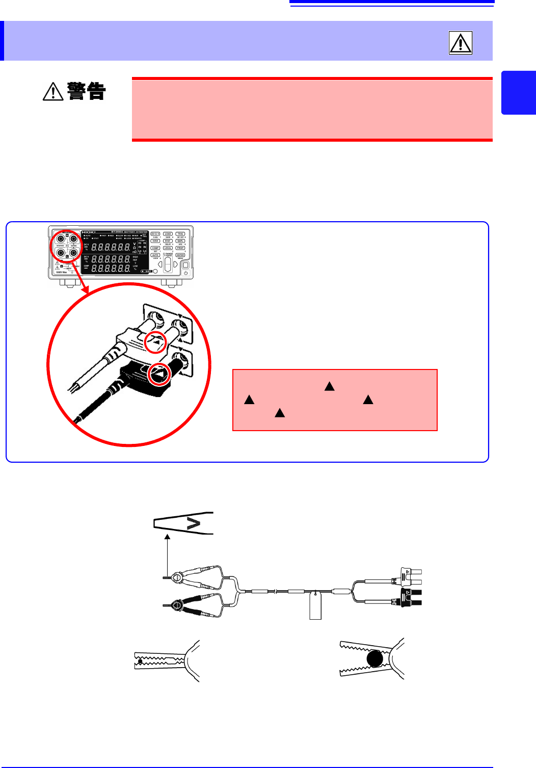 • 为了防止电池短路事故,在本仪器上连接或拆卸测试线时,请务必确认测试线顶