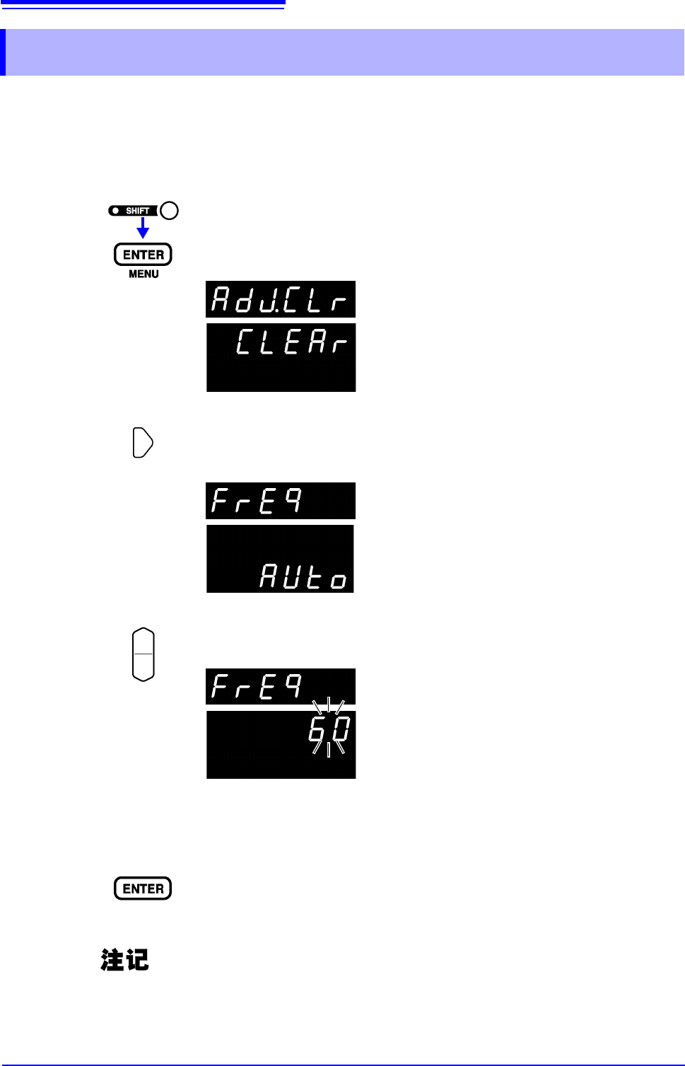 在初始状态下为自动识别电源频率设定 (AUTO),但也可以手动进行设定。如果未正确设定电源频率,测量值