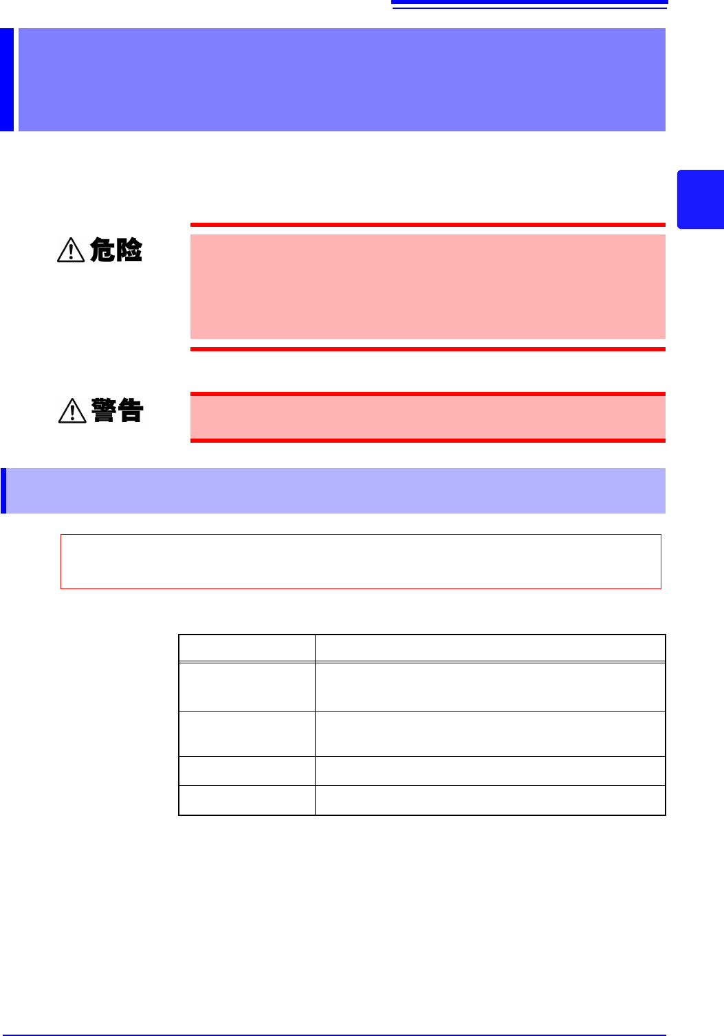 3.1 测量前的检查 21 3 在测量之前,请务必阅读 “使用注意事项” ( ⇒ 第 3 页 ) 和“ 第 2 章 测量前的准备” ( ⇒ 第 15 页 ) 。 以下为检查内容举例。 测量方法 第 3 章 • 为了防止发生触电事故,请勿将测试 线顶端和有电压的线路发生 短路。 • 请勿测量 DC ± 1000 V 以上的电压。 也不要测量交流电压、 交流电流以及直流 电流。否则,可能会导致本仪器损坏 ,造成人身伤害事故。 • 对地最大额…