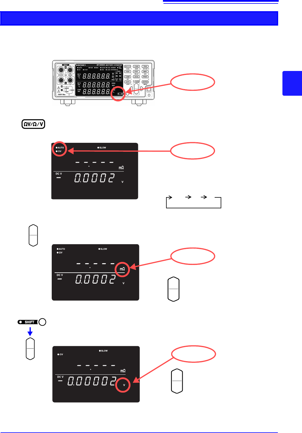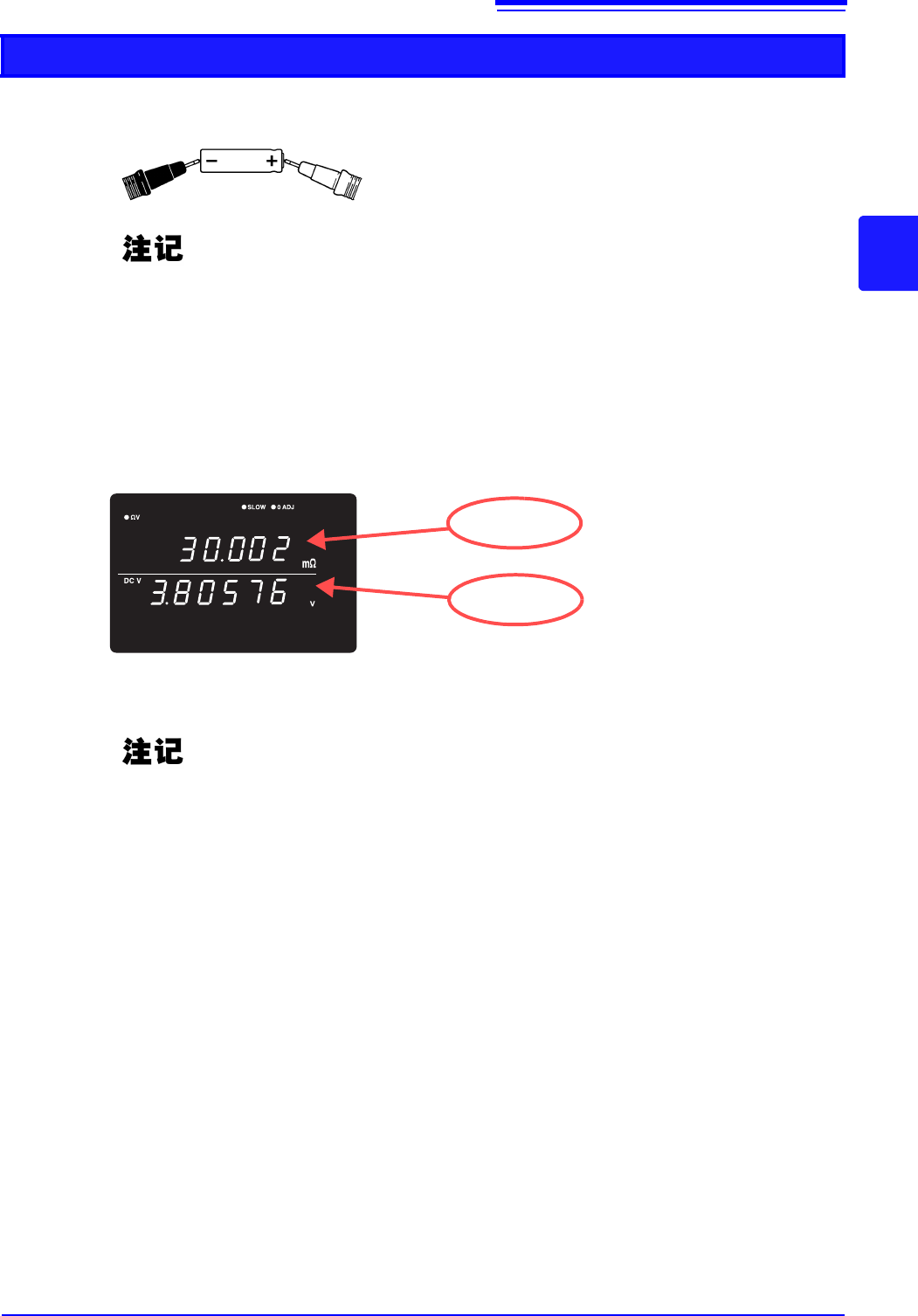 • 3 mΩ、 30 mΩ、 300 mΩ量程的开路端子电压在开路约500 ms之后变为4 V peak。