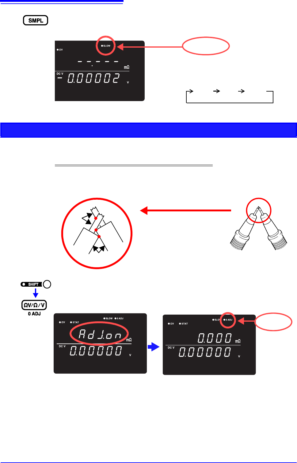 3.2 基本测量举例 24 9 选择采样速度。 (此时选择 SLOW ) 参照: “ 3.5 设定采样速度” ( ⇒ 第 30 页 ) 每按下一次键,都对采样速度 进行切换。 FAST SLOW MED SLOW 点亮 执行调零 10 使用正确的方法对测试线的顶端 实施短路。 如果未以正确的方法执行调零, 则无法得到正确的测量值。 参照: “ 3.6 执行调零” ( ⇒ 第 31 页 ) <例>使用 9770 针型测试线时 11 ( S…