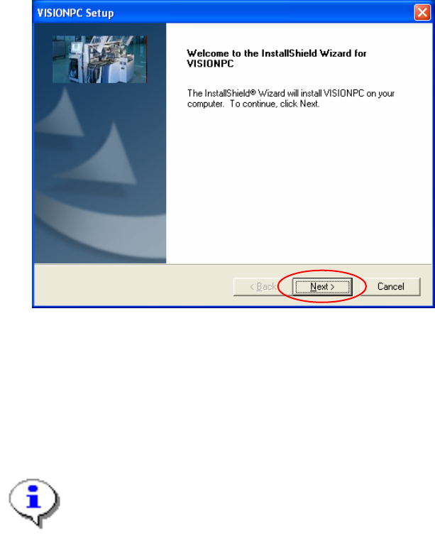 Installation of the vision computer software continues with the welcome screen.