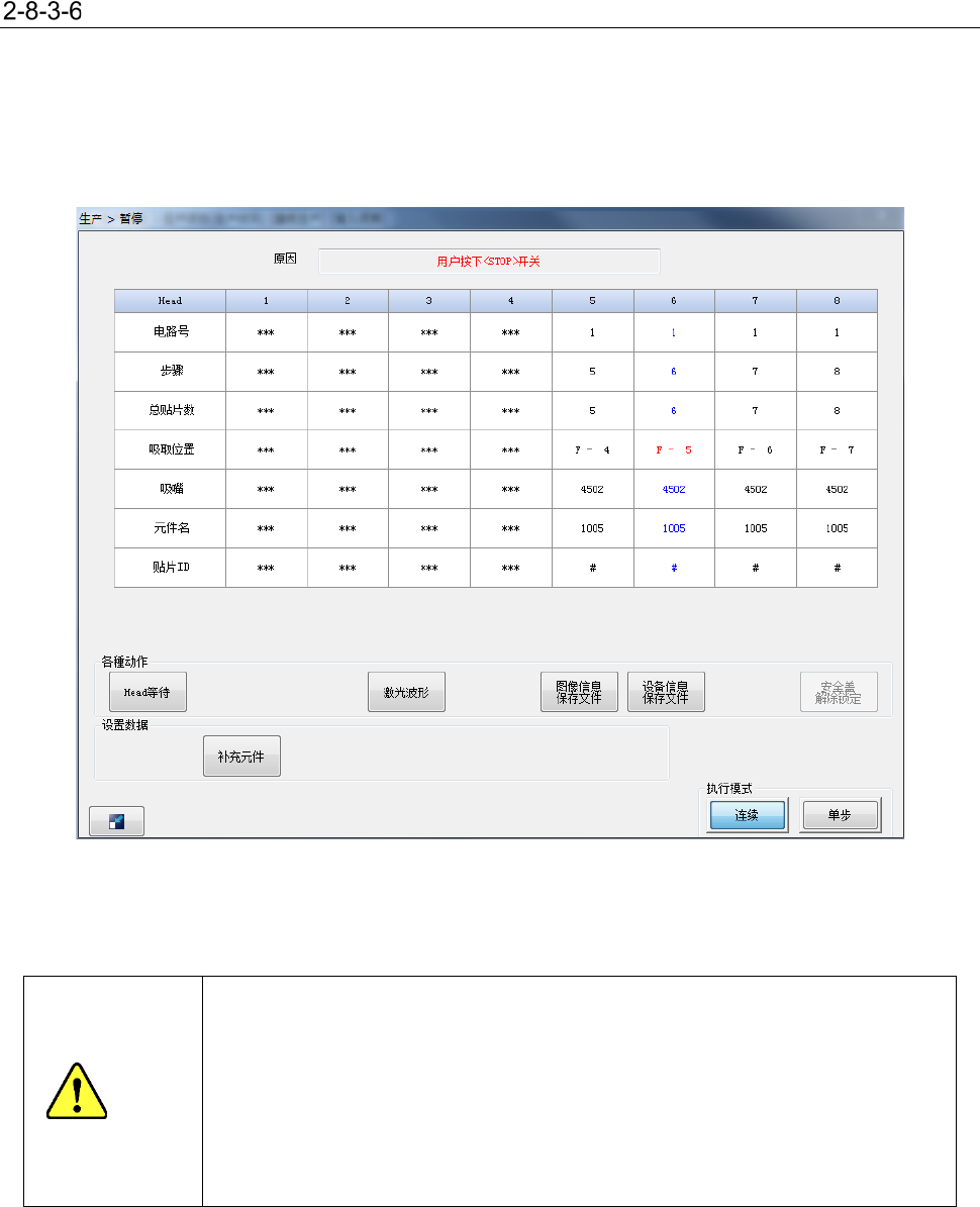 第 1 部 基本篇 第 2 章 生产 2- 55 (1) 在生产 条件的 执 行模式 项目中勾选「单步 」时 ,按下操作画 面上 的 <ST AR T> 按钮 开始生产 运行,也会 变为生产状态 画面。 在此基础 上,与 暂停画面一样 ,将 显示单 步生产 画面 。 (2) 在连续 生产中暂 停时,按下画面 上的 [ Head 等待 ] 按 钮 ,可将 Hea d 移动到退避位置。 (3) 在单 步生 产中停止, 或在连续生…
