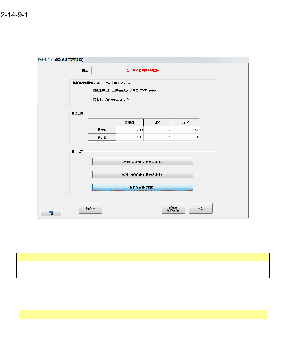 第 1 部 基本篇 第 2 章 生产 2- 151 2- 14 - 9 贴片基板面高度测量 搬入基板后的基板高度测量 在操作选项 勾选了 [贴片基板面 高度测量 ] 时,在 生产中测量贴片 基板面高度 。 操作 选项 的[ 在贴片前测量 贴片基板 高度] 为 无效 时, 则在基板搬入 后 统一 进行 测量 。 发生测量错误 时,显示下图 并成为 暂停 状态。 (1) 基本 信息 显示 基板面 高度测量的 最大 值与最小值。 项目 内容 …