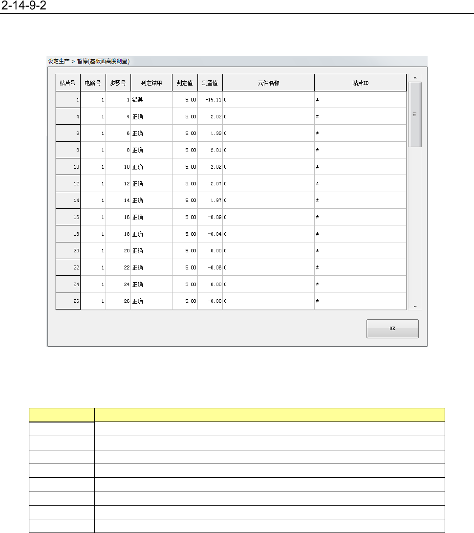 第 1 部 基本篇 第 2 章 生产 2- 153 基板高度测量结果一览 在贴片 基板面高度错误 画面 选择「结果一览」 , 则执 行基板高度测量 结果的一览显示 。 (1) 结果一览 显示贴片号、电 路号、步 骤号 、判定 结 果、判定 值、测量值、 元件名、贴片 ID 。 项目 内容 贴片号 显示执行基板面 高度测量的贴片点的贴片 号。 电路号 显示执行基板面 高度测量的贴片点的电路 号。 步骤号 显示执行基板面 高度测量的贴片点的…