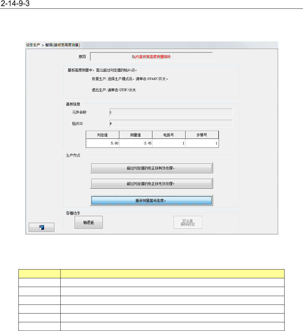 在贴片基板面高度错误画面,按下<START>按钮时,执行重新开始生产模式所指定的动作。