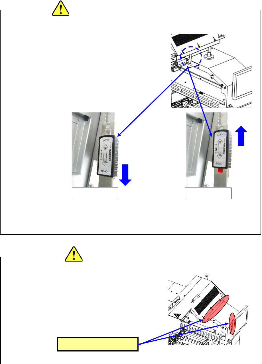 第 1 部 基本篇 第 1 章 装置概要 1-9 ◆ 打开 安全盖(安全罩) 时,先把 盖(罩) 子推上去, 再把锁杆向箭头 ( L OCK )方向推,锁好。 确认上了锁之后 ,再放开手。 ﹡ 没有上 好锁就松 手时, 安全盖(安 全罩)有落下 来的危险。 ◆ 要关 安全盖(安全罩) 时,要先 解开锁, 再关闭。 把安全盖(安全 罩)向上提, 再把锁杆向 OPEN 方向 推,解锁。 (请注意,解锁 时要防止安全盖(安全罩 )落下来 受伤…
