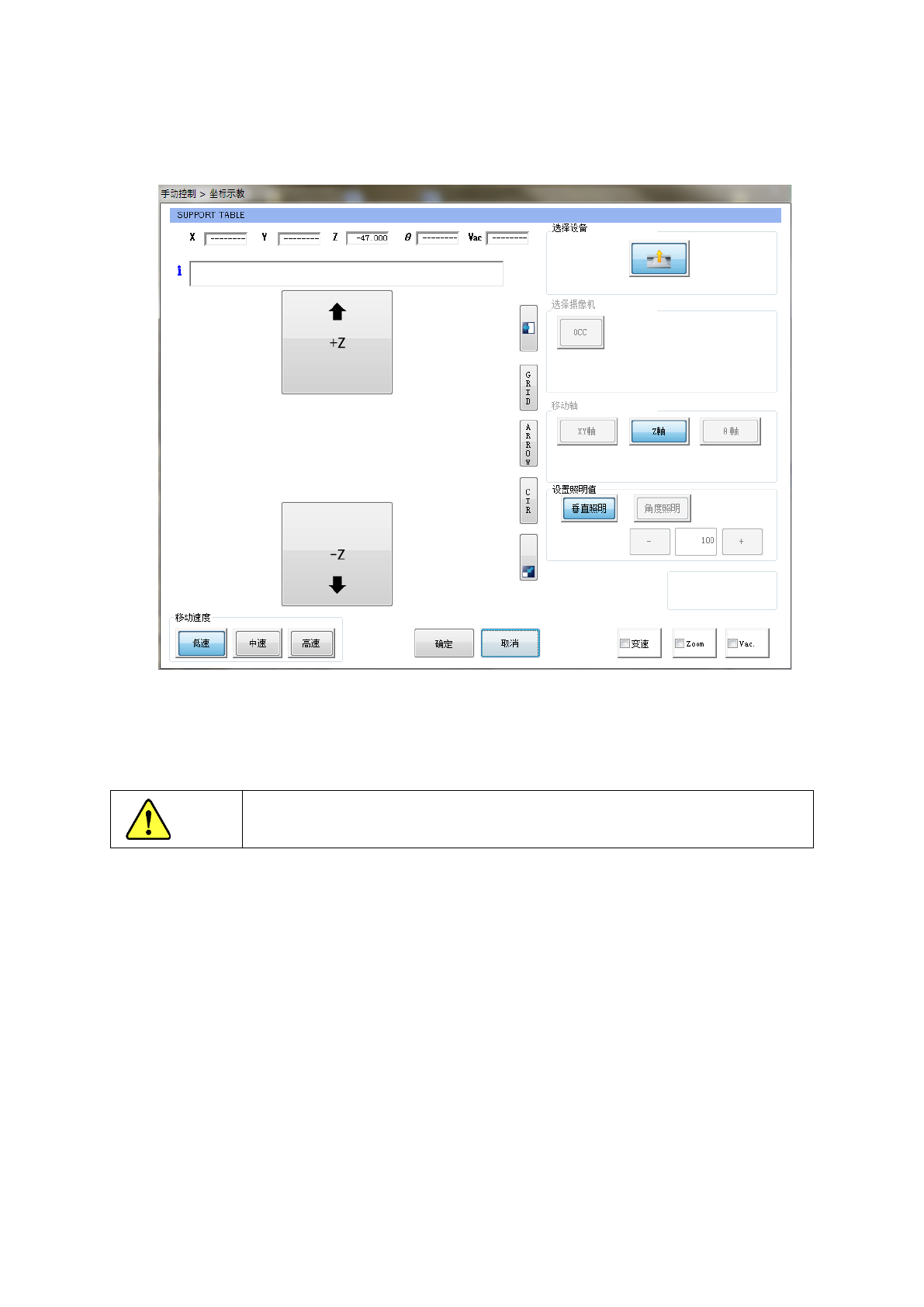 第 1 部 基本篇 第 4 章 制作生产程序 4- 175 (4) 过支撑台示教 通过 基板厚度等项 目启动示教 ,即 可启动支撑 台的示教 画面 。 仅 在使用马达 驱动支撑台 时可以 操作。 按画面 左侧的上下方向 箭头按钮 ,支撑台就 会上下移动 。 支撑台移动的 当前坐标 ,会显示 在 画面上部 。 注意 为了避免人身伤 害,在示教操作过程中, 切勿将手 放入装置内部, 也不要将脸 和头靠近装置。